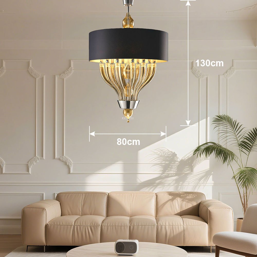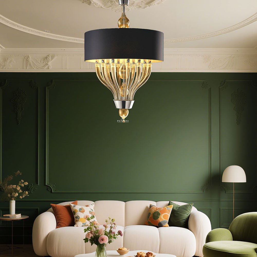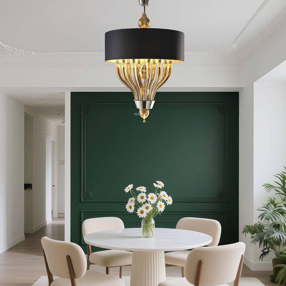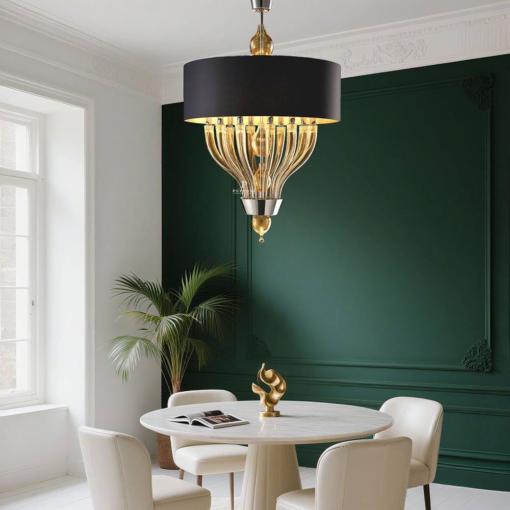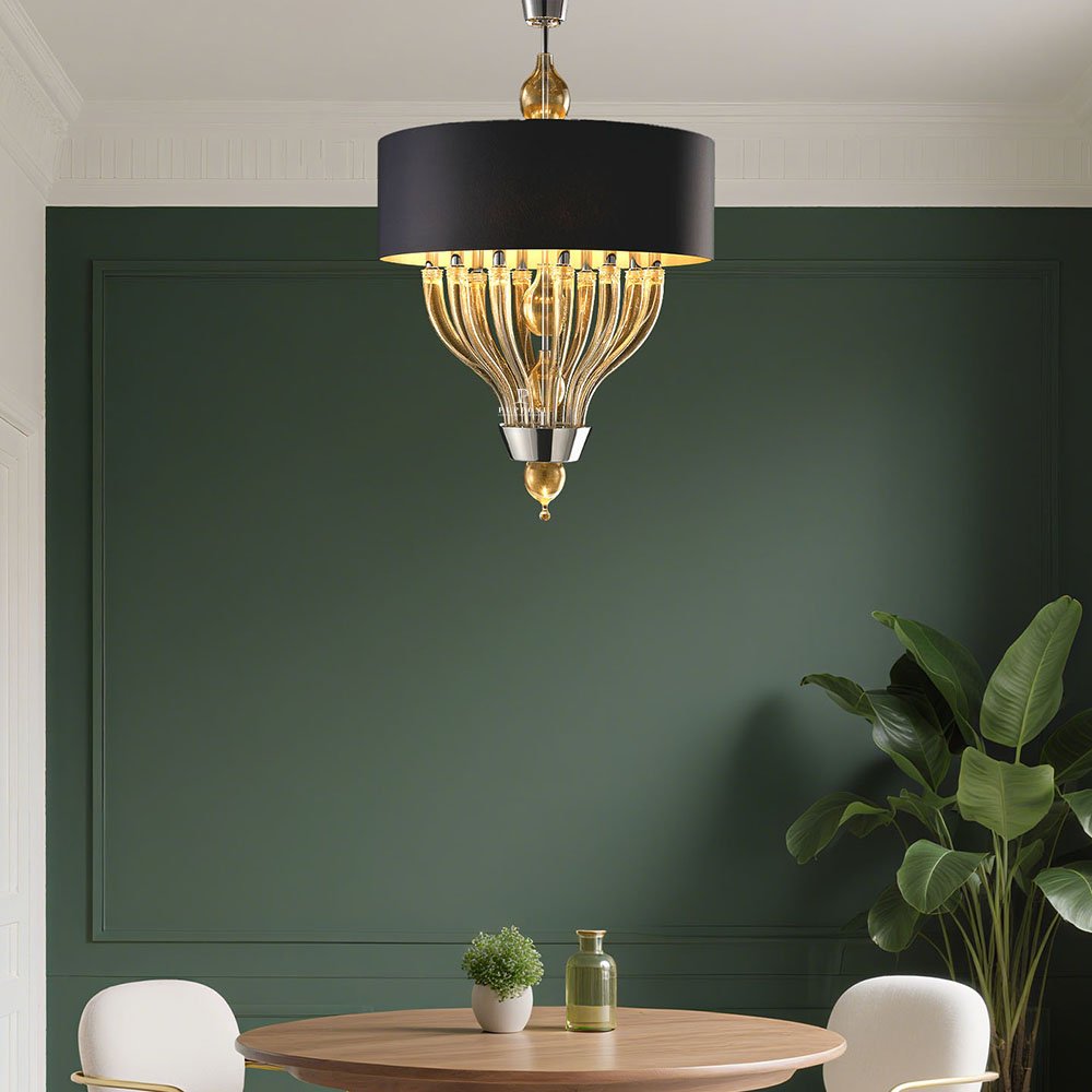 Elegant Art Deco chandelier features geometric glass shades. Its polished metal frame creates a striking modern silhouette, perfect for dining rooms and entryways.