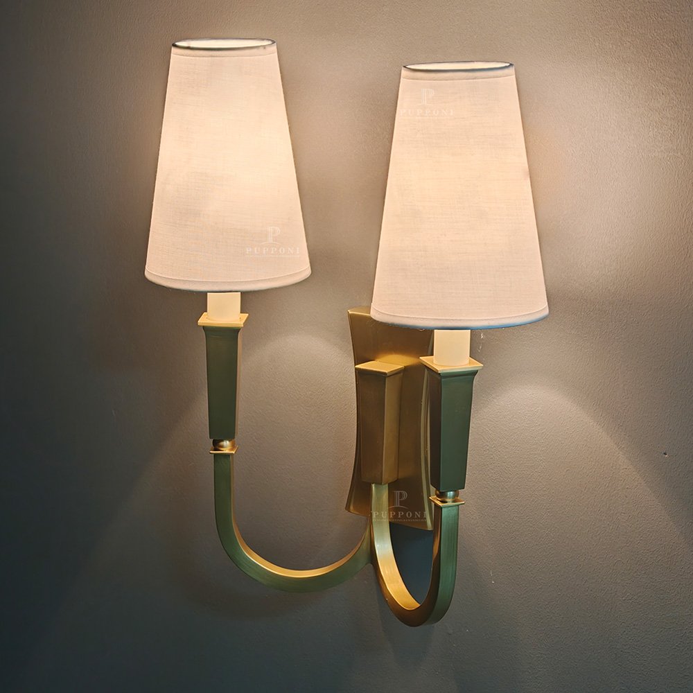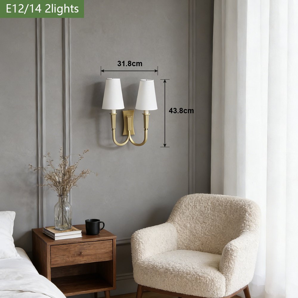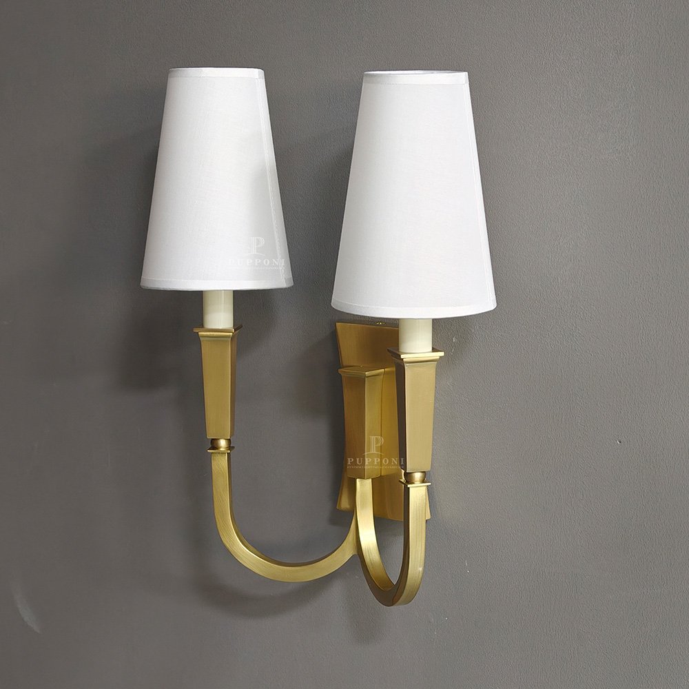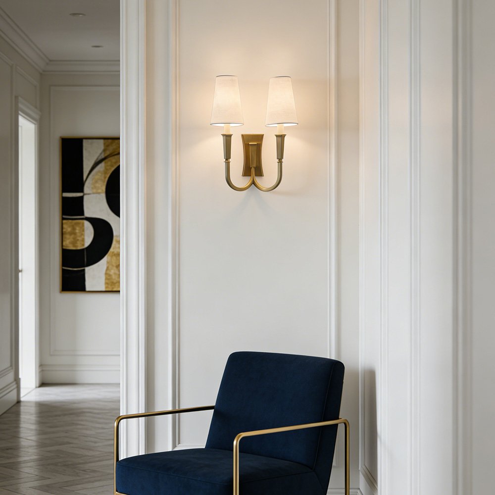 Elevate your space with this elegant double-arm brass wall sconce. Featuring a polished gold finish and soft linen shades, it casts warm, diffused light perfect for bedrooms, living rooms, or entryways. Its timeless design blends seamlessly with traditional, modern, and transitional interiors, adding refined sophistication and functional illumination to any room.