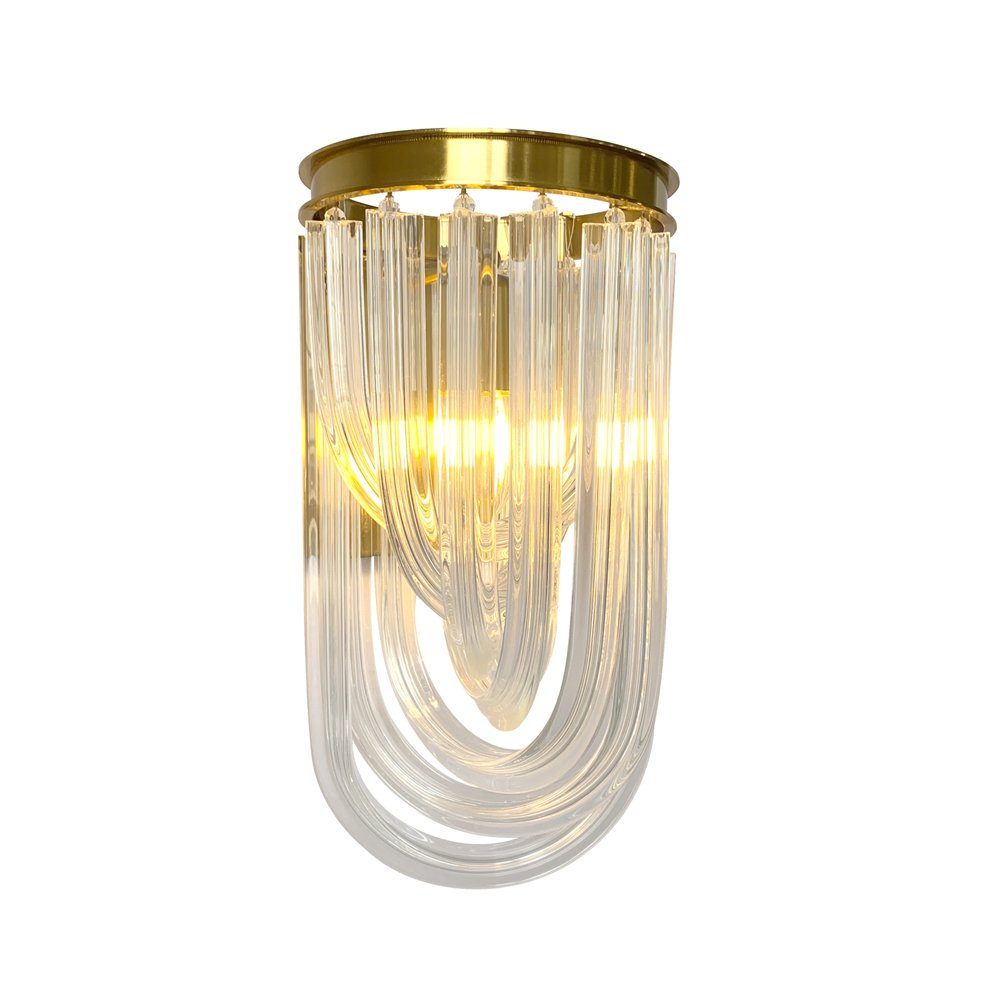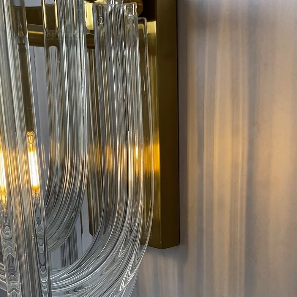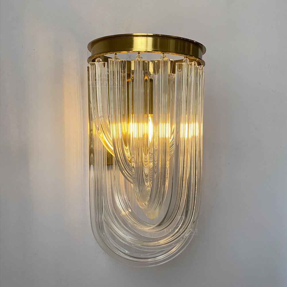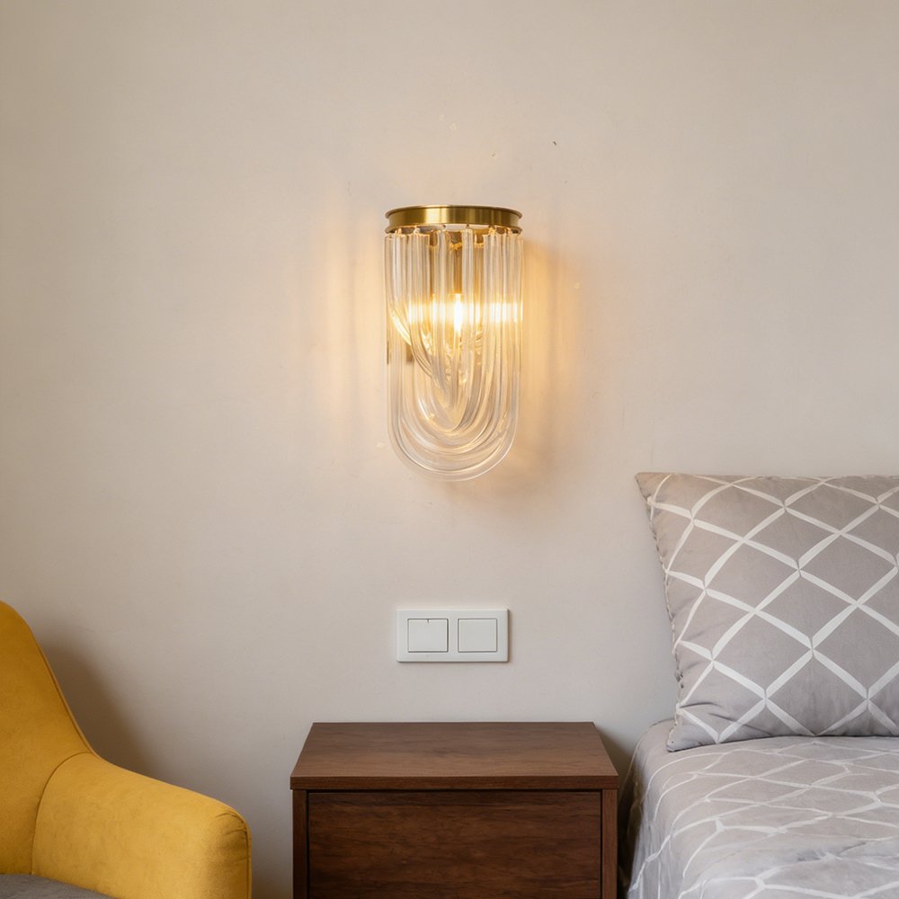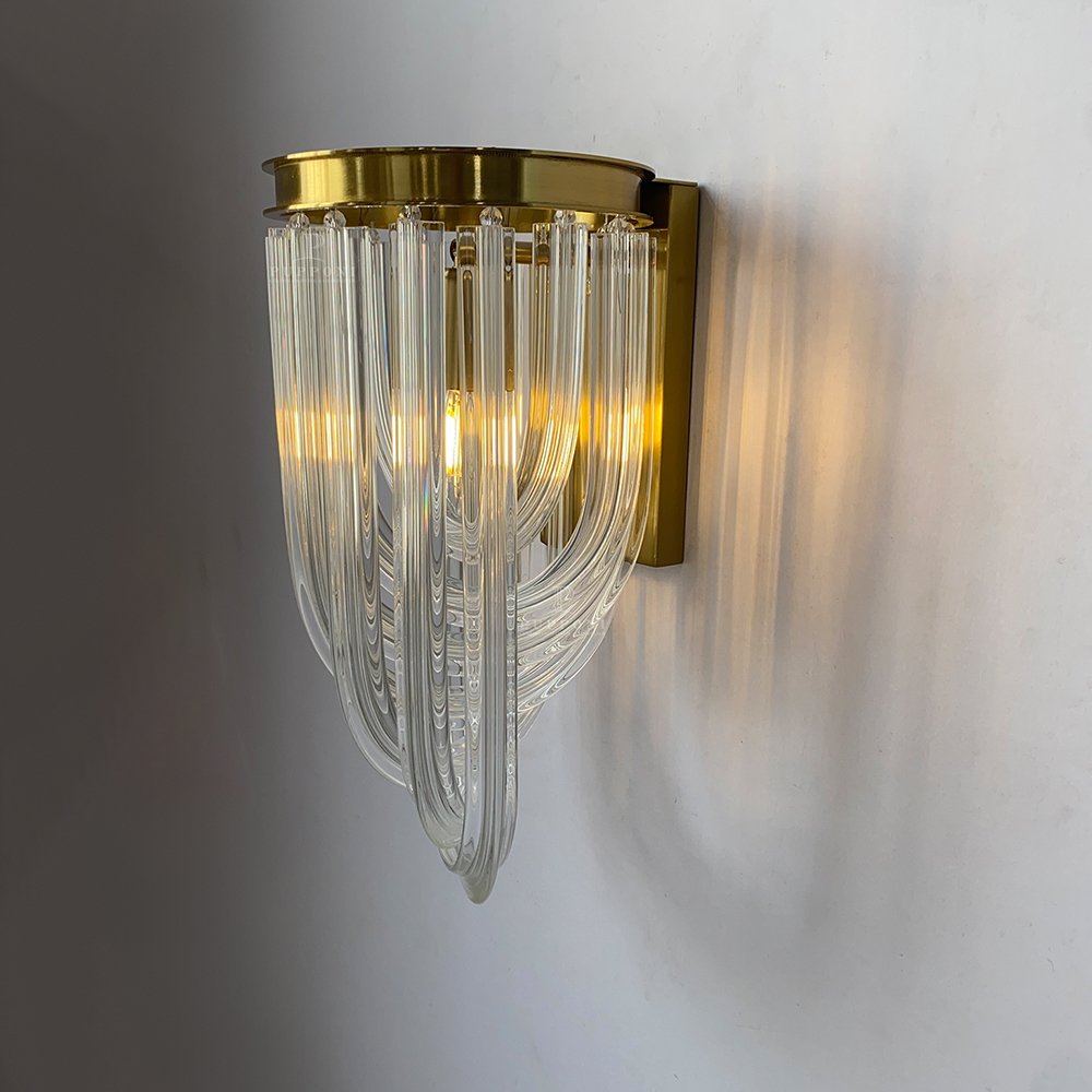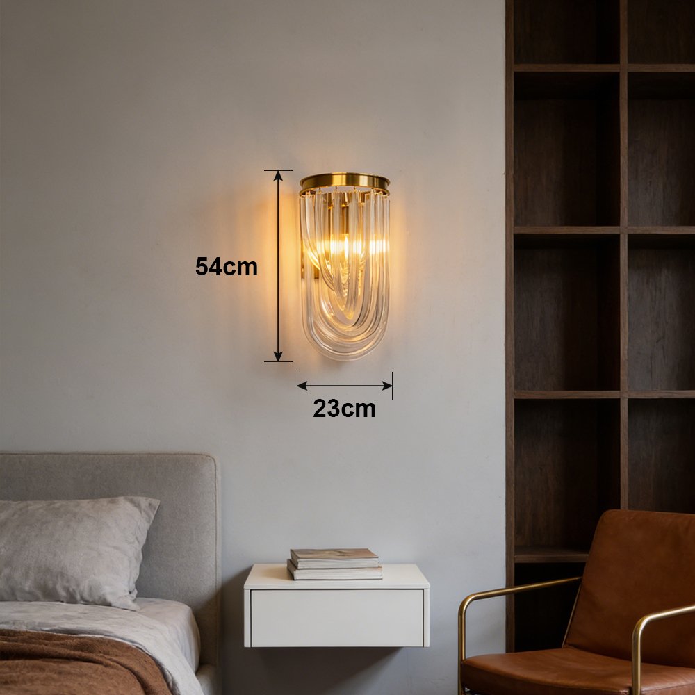 Elevate your space with this elegant U-shape wall sconce. Crafted with a polished brass frame and hand-blown curved glass rods, it casts a warm, ambient glow that refracts beautifully across walls. Perfect for bedrooms, living rooms, or entryways, this timeless piece blends modern luxury with artisanal craftsmanship, adding refined sophistication to any interior.
