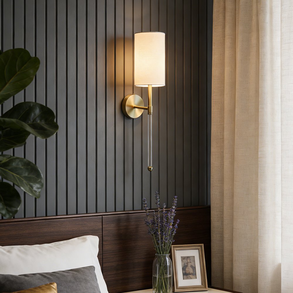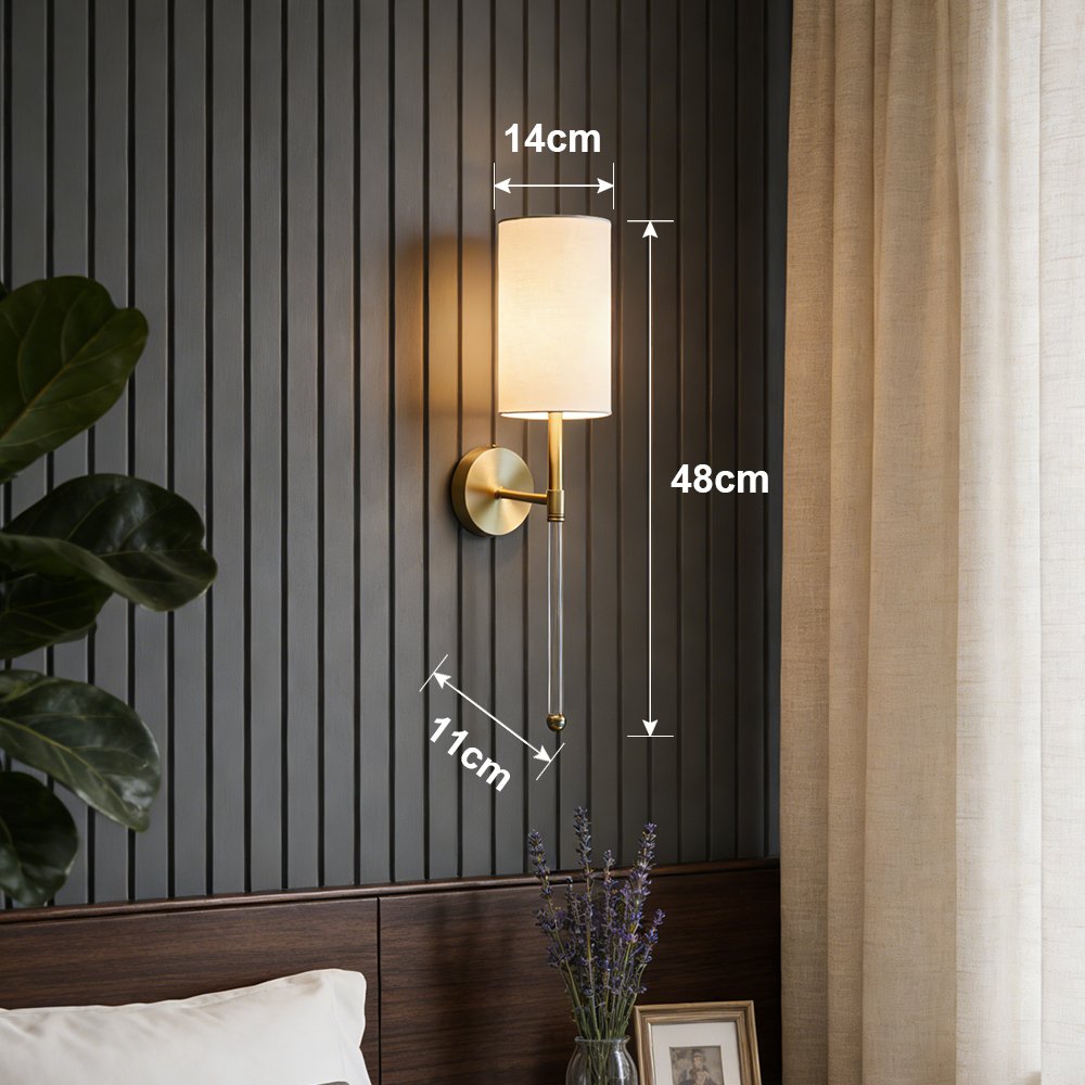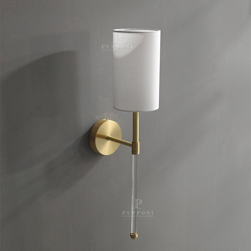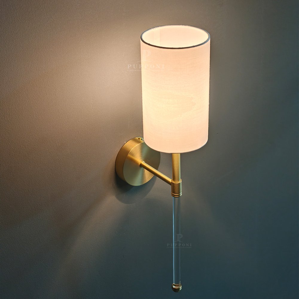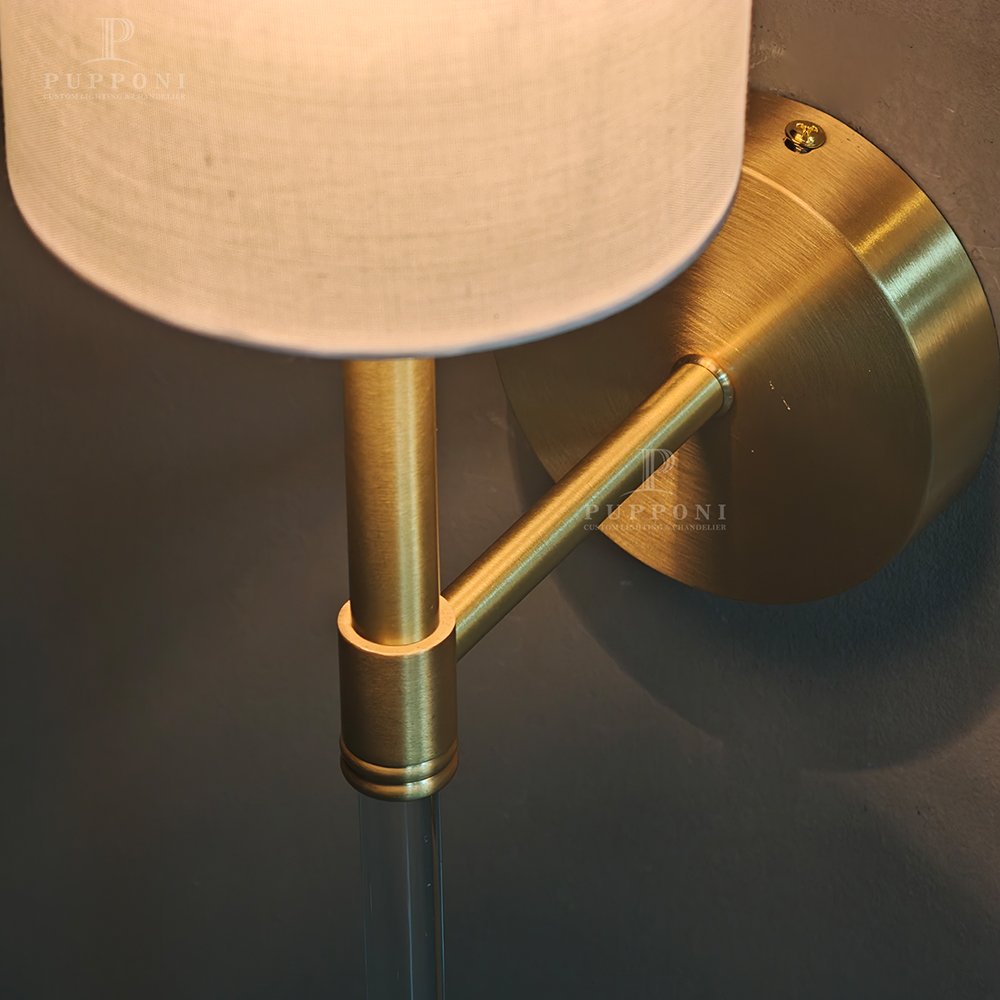 Elevate your space with this sleek modern wall sconce. Crafted with a polished brass base, clear glass stem, and soft linen shade, it casts warm, diffused light perfect for bedrooms, living rooms, or hallways. Its minimalist design blends seamlessly with contemporary, mid-century, and modern interiors, adding functional elegance and timeless style to any room.