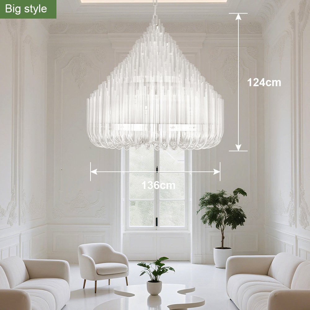 This chic glass chandelier combines crystal-clear glass with intricate details to create a captivating light feature. A perfect addition for those seeking a sophisticated, yet modern style.