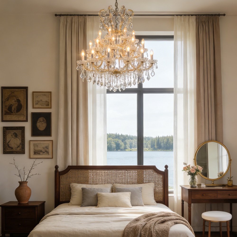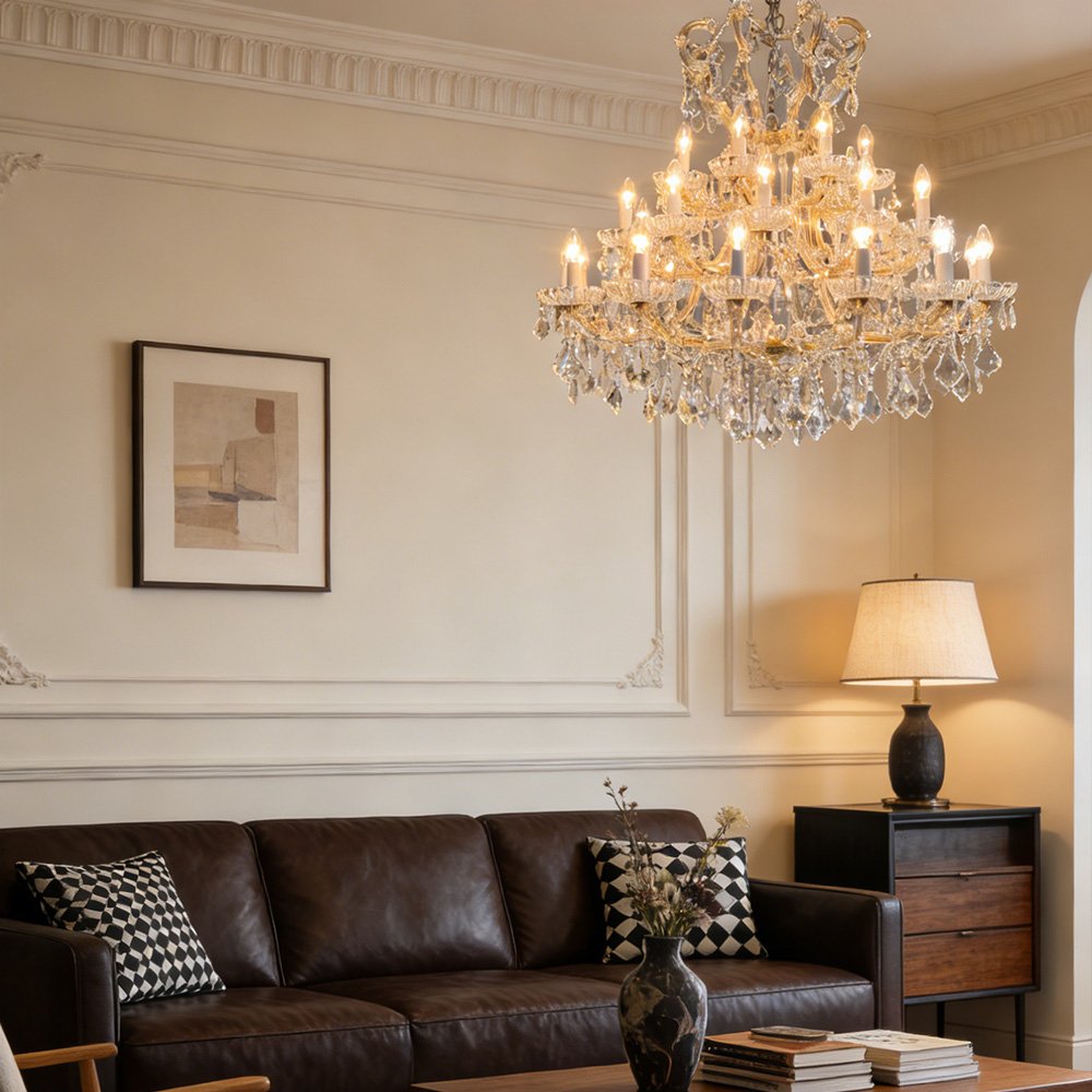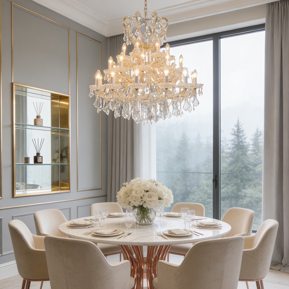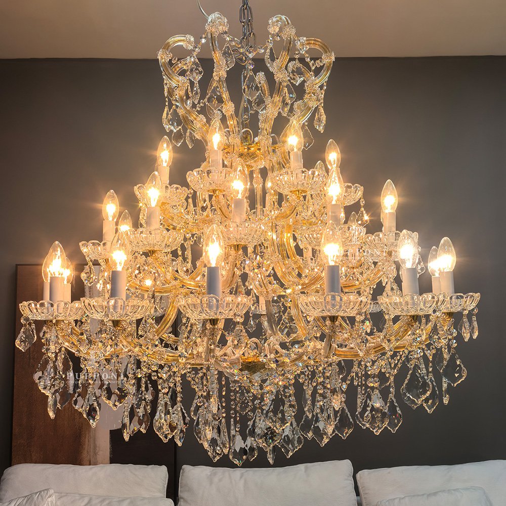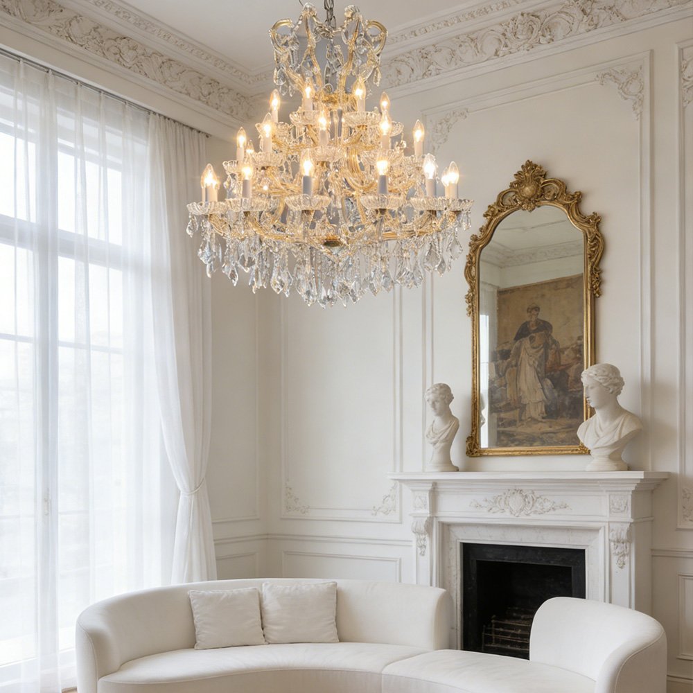 Elevate your home with this classic gold crystal chandelier. Crafted with a polished gold frame, cascading crystal prisms, and candle-style bulbs, it casts a warm, luxurious glow that refracts beautifully across walls. Ideal for living rooms, dining areas, or entryways, this timeless piece blends traditional elegance with modern luxury.
