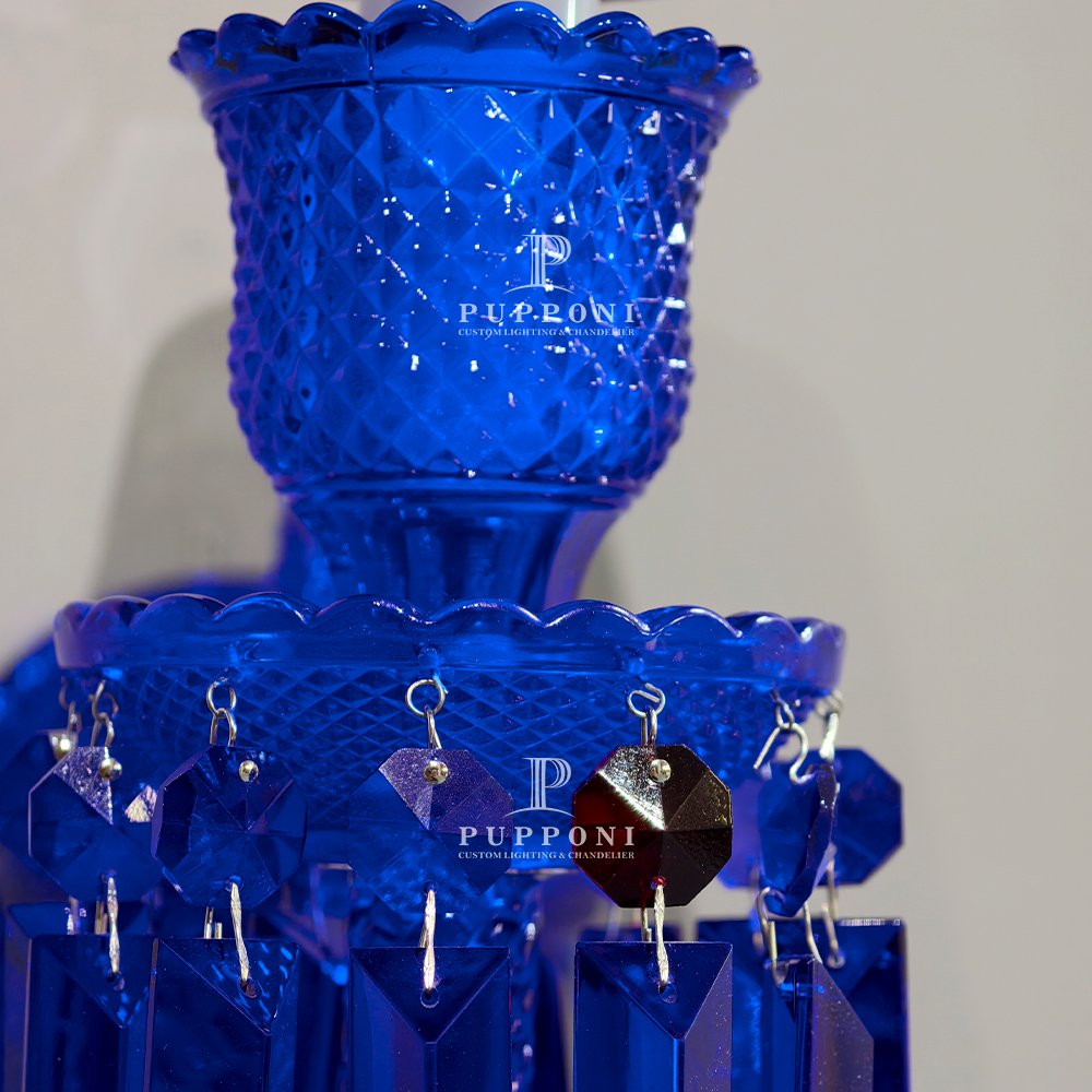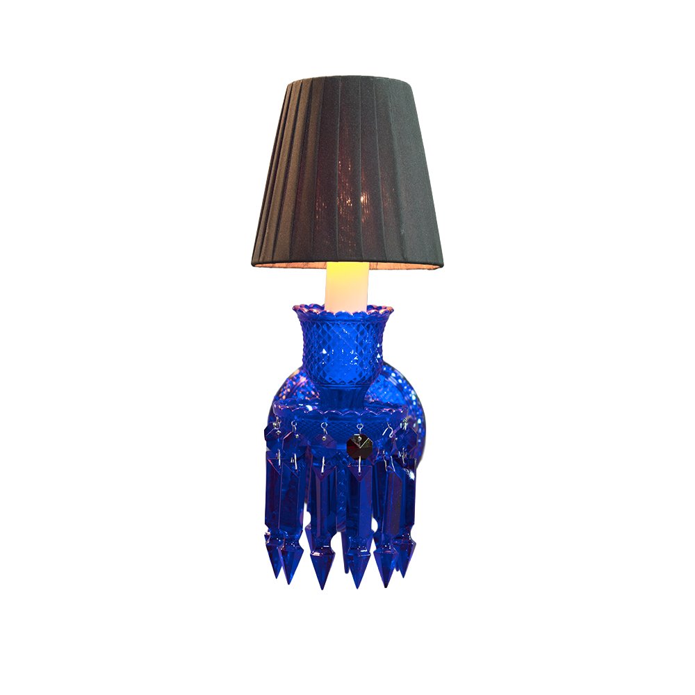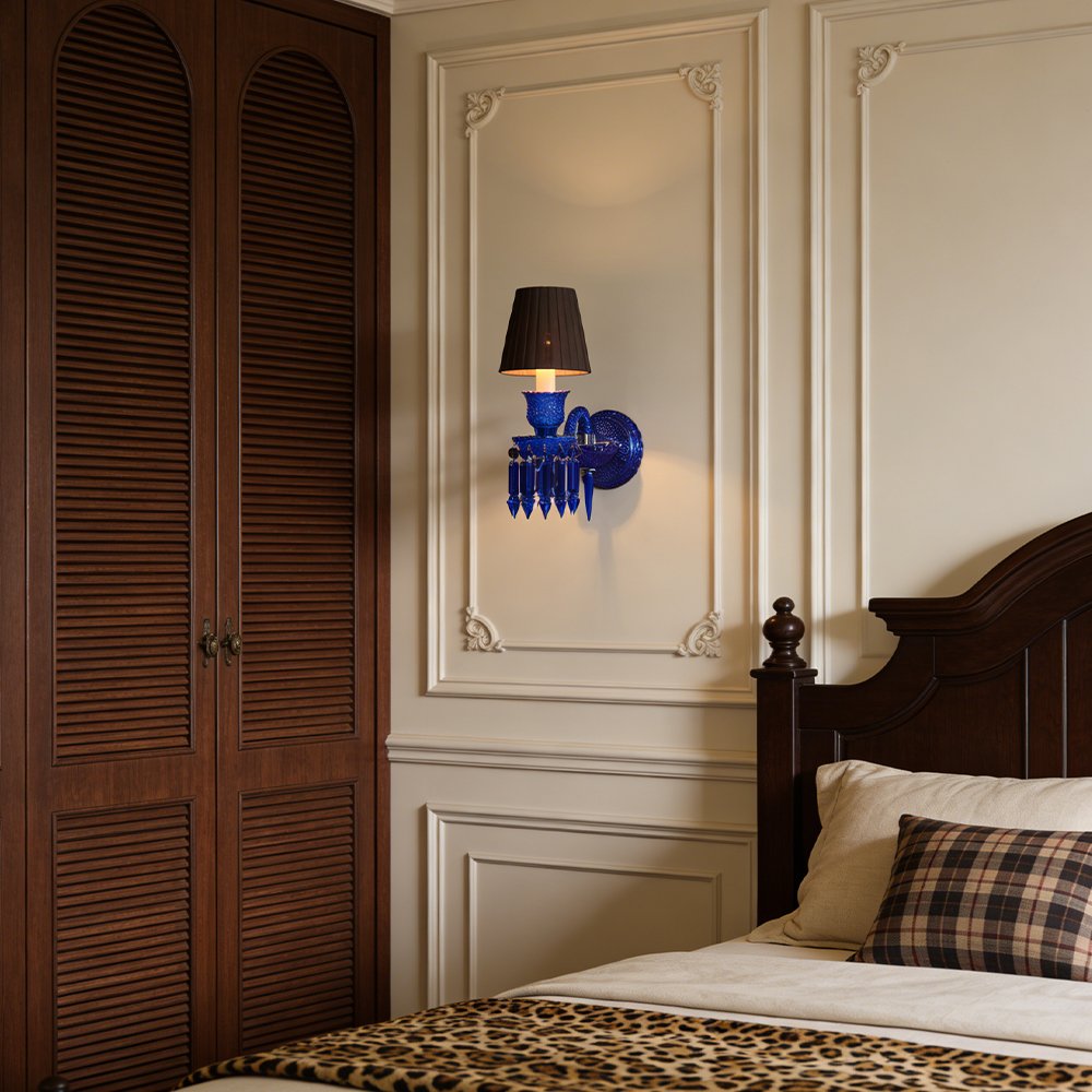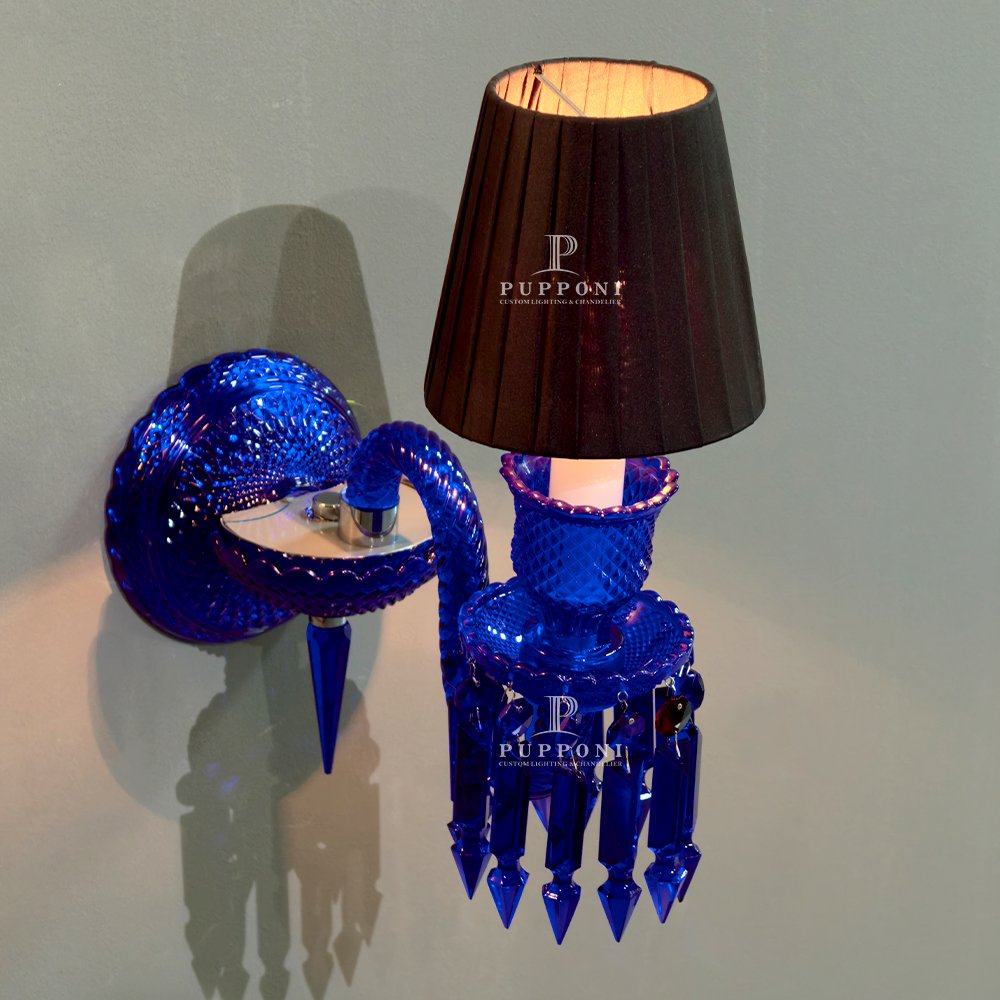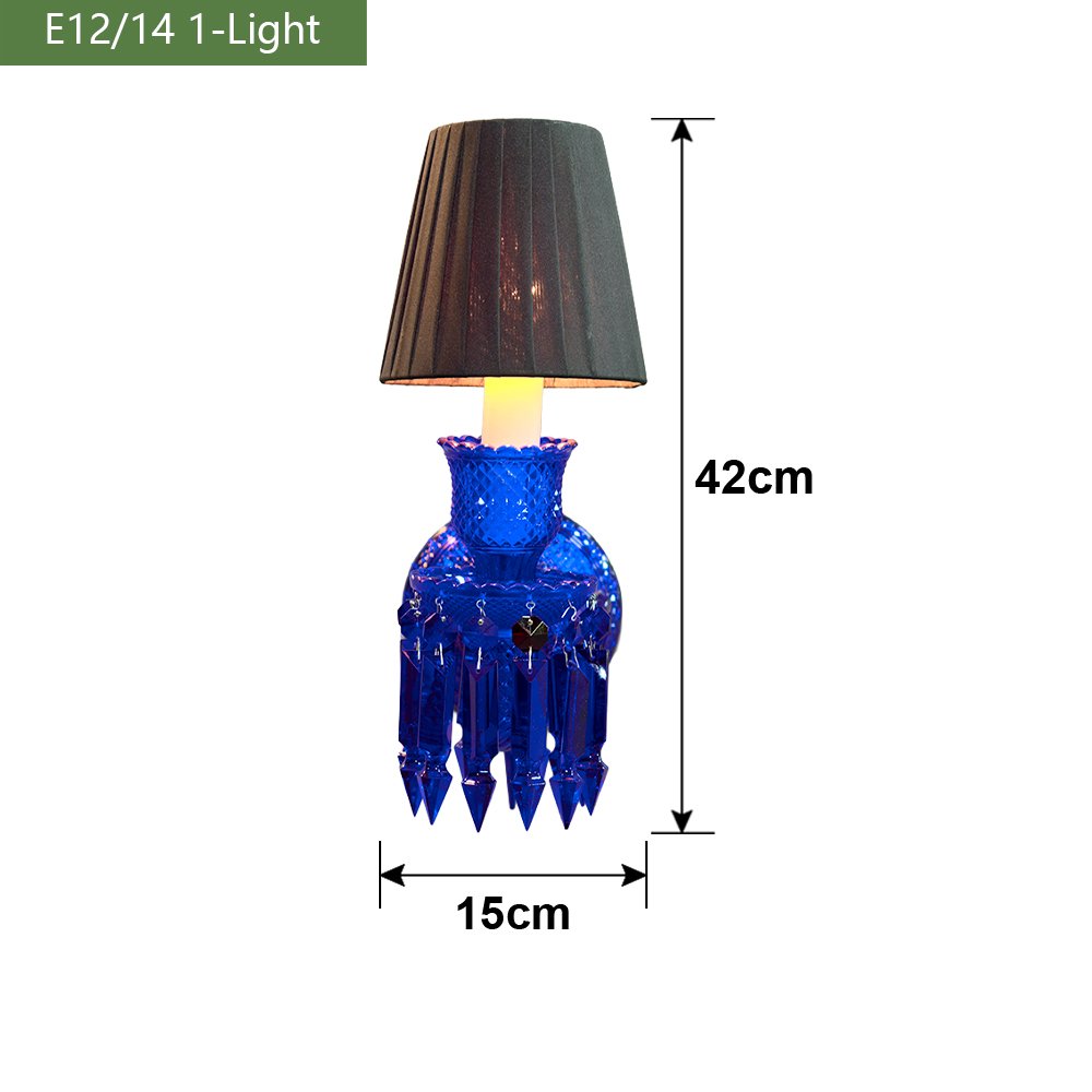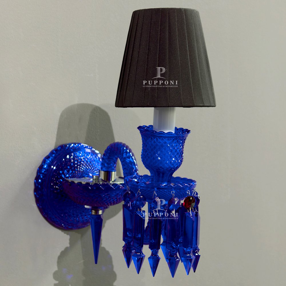 Make a bold statement with this stunning cobalt blue crystal wall sconce. Crafted with hand-cut blue glass, sparkling crystal prisms, and a pleated black shade, it casts a warm, glamorous glow. Perfect for living rooms, bedrooms, or entryways, this eye-catching piece blends vintage charm with modern luxury, adding opulence and personality to any interior.