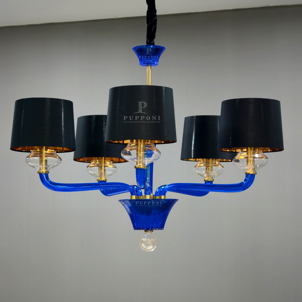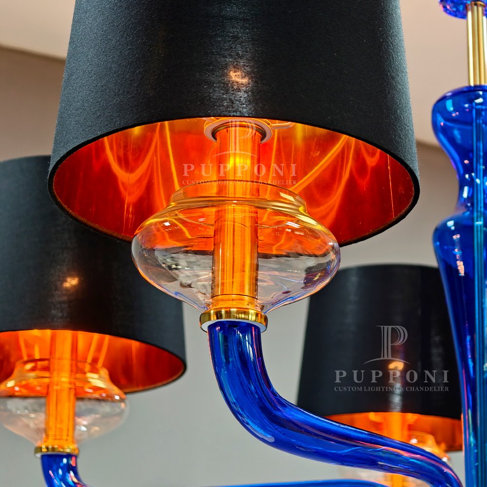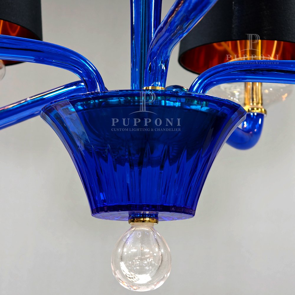 Elevate your space with this handcrafted cobalt blue Murano glass chandelier. Featuring swirling blue glass arms, polished brass accents, and black linen shades with gold lining, it casts a warm, bold glow perfect for living rooms, dining rooms, or entryways. This statement piece blends artisanal craftsmanship with modern luxury, adding vibrant opulence to any interior.