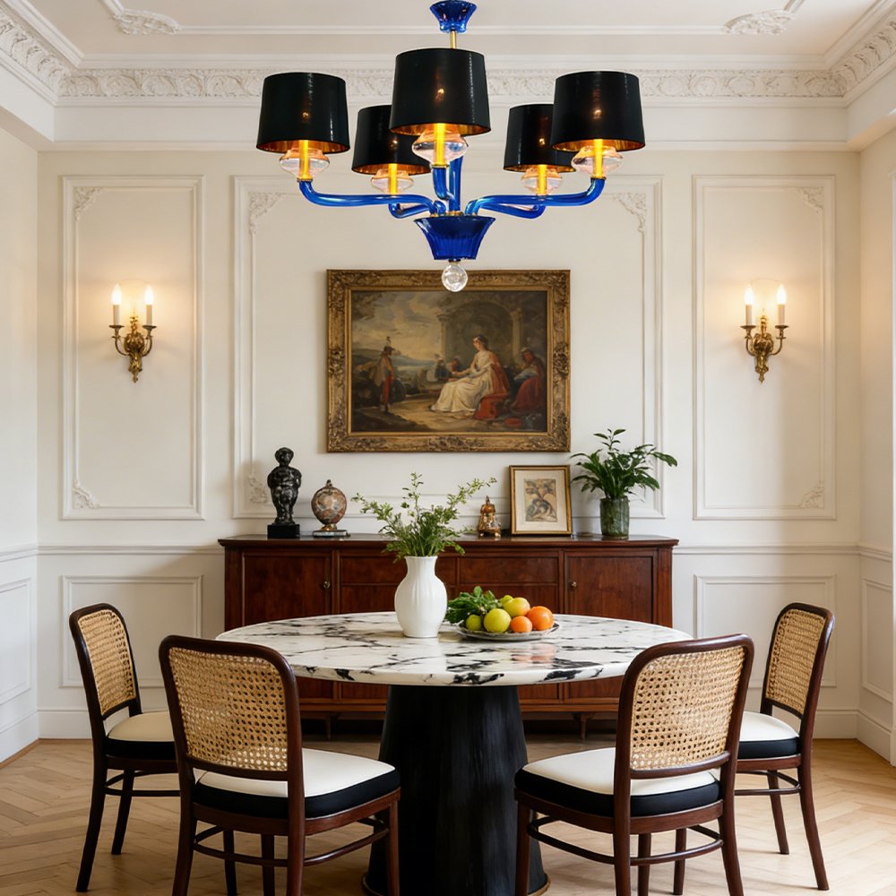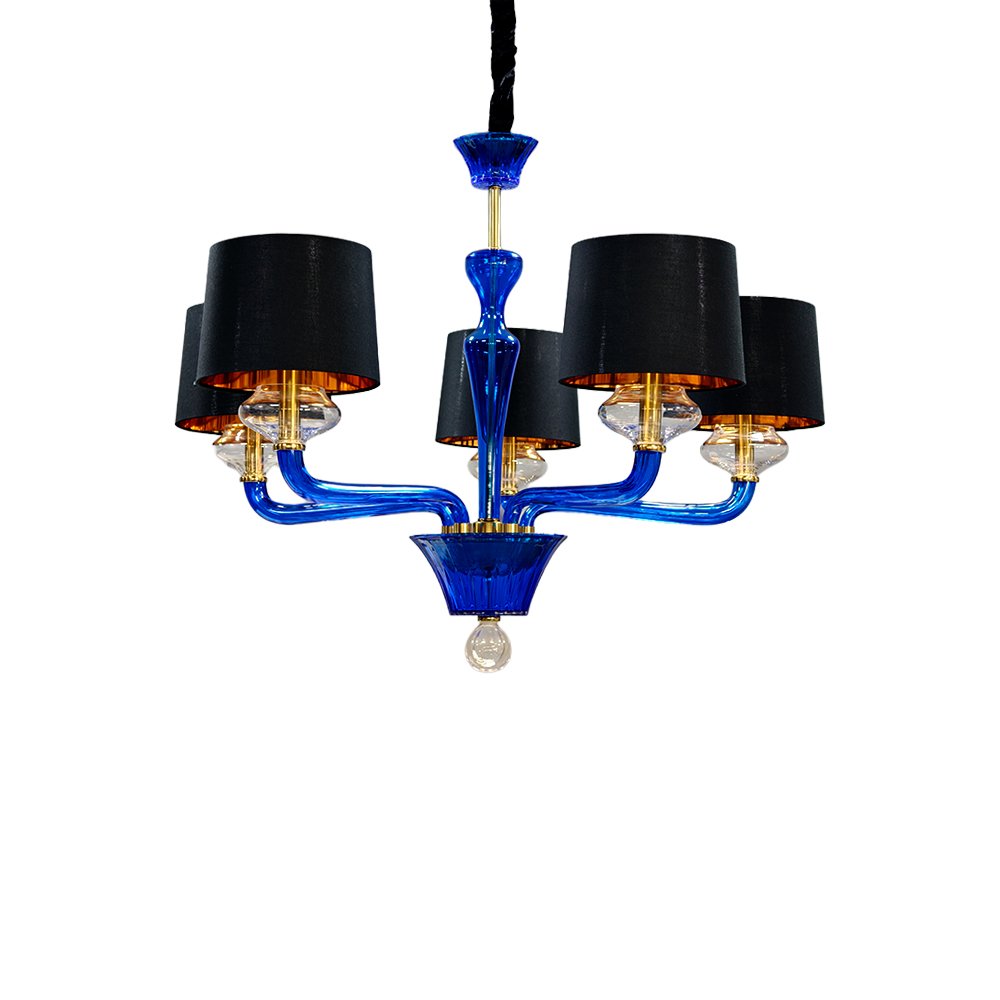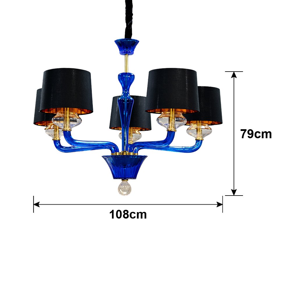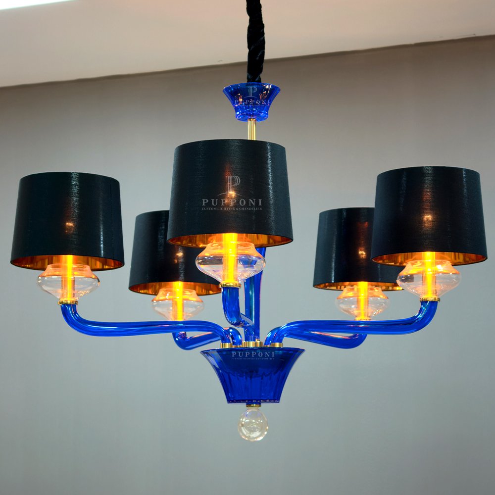 Elevate your space with this handcrafted cobalt blue Murano glass chandelier. Featuring swirling blue glass arms, polished brass accents, and black linen shades with gold lining, it casts a warm, bold glow perfect for living rooms, dining rooms, or entryways. This statement piece blends artisanal craftsmanship with modern luxury, adding vibrant opulence to any interior.