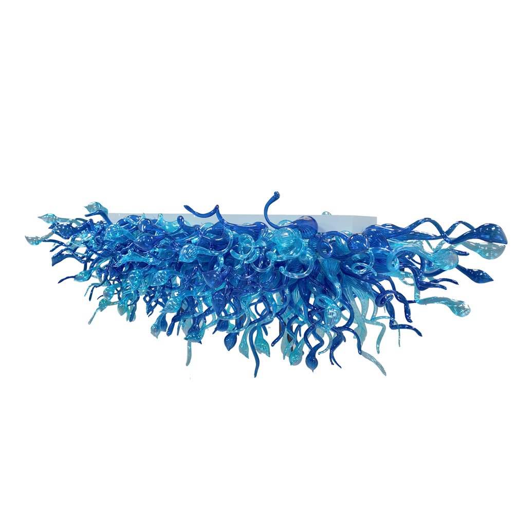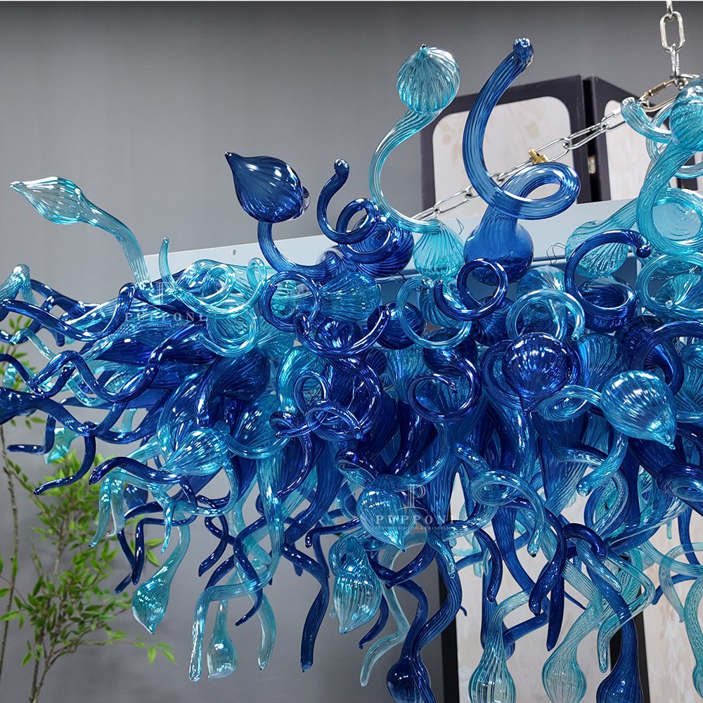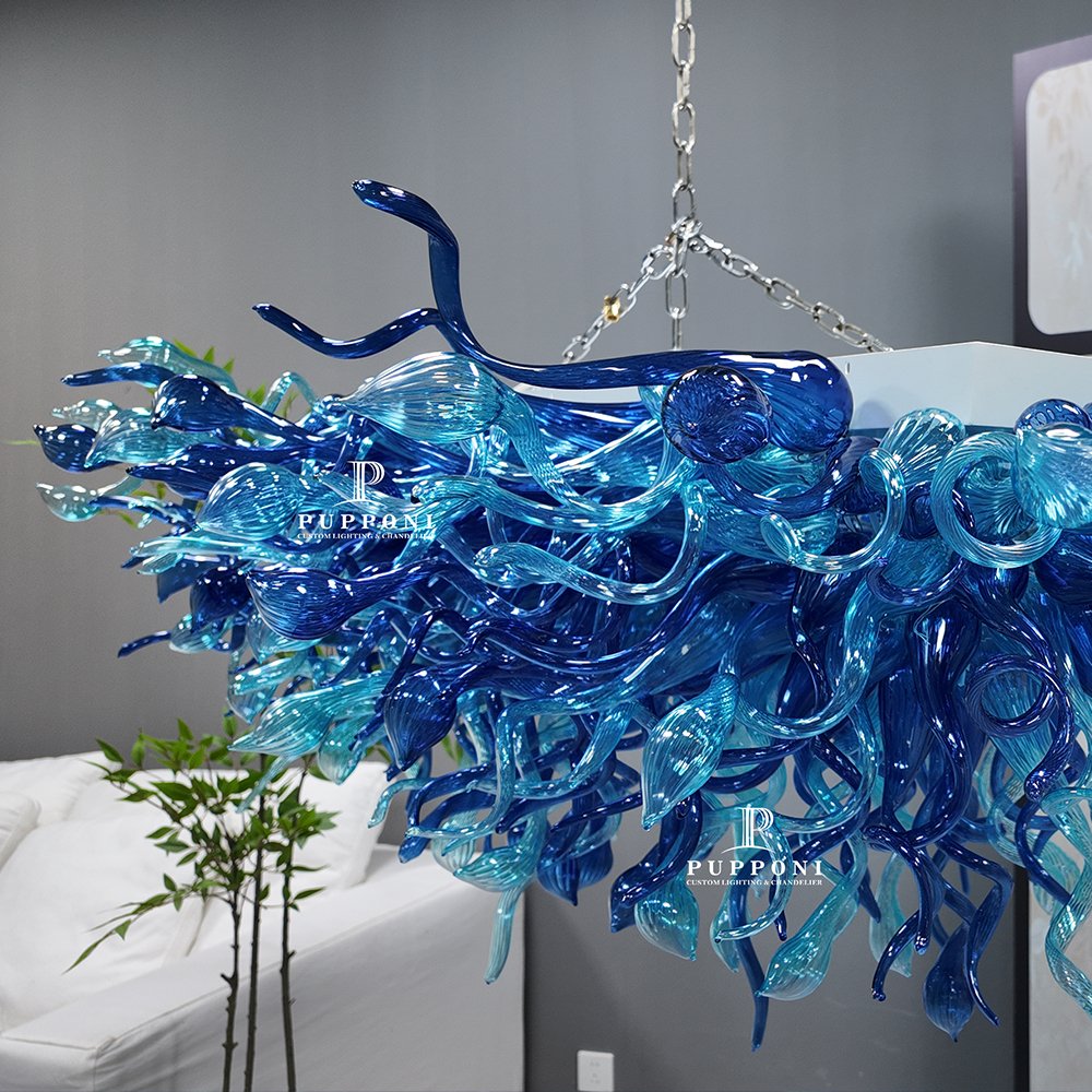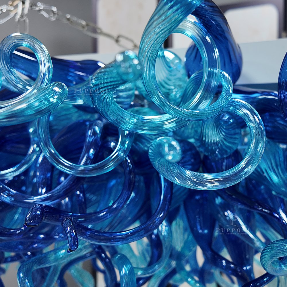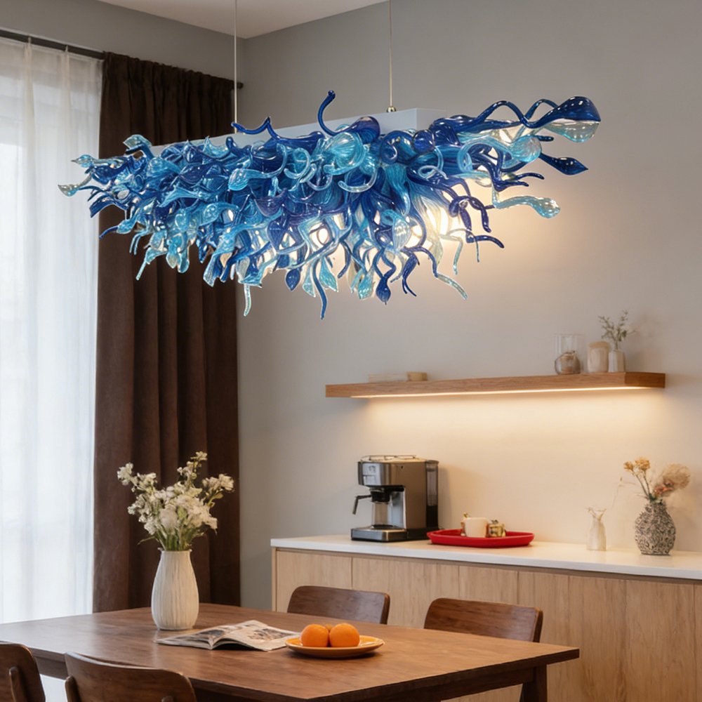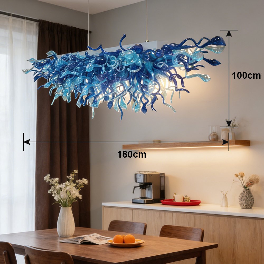 Elevate your space with this stunning hand-blown blue glass chandelier. Crafted with swirling, organic glass forms in gradient ocean blues, it casts a warm, artistic glow. Perfect for dining rooms, kitchens, or luxury interiors, it brings a breathtaking, one-of-a-kind focal point to any space.