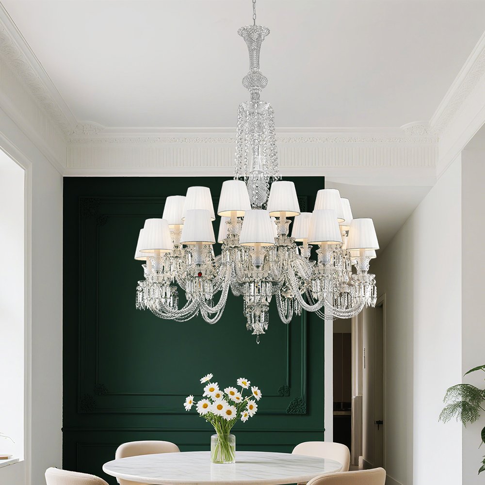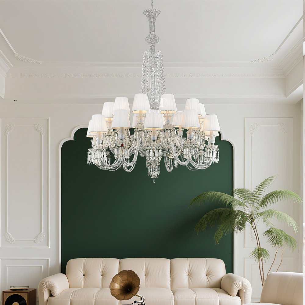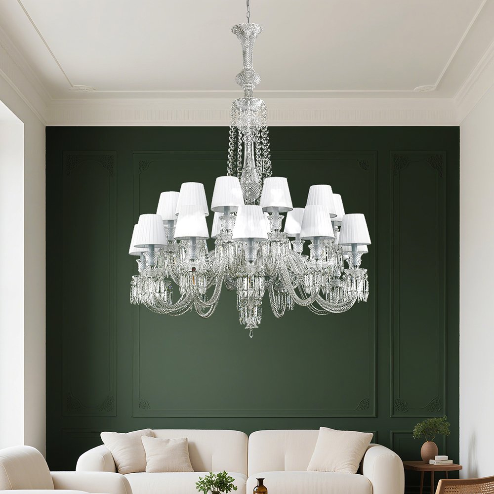 Large crystal chandelier delivers grandeur and sparkle, perfect for hotel lobbies and wedding halls.