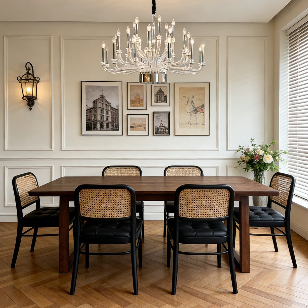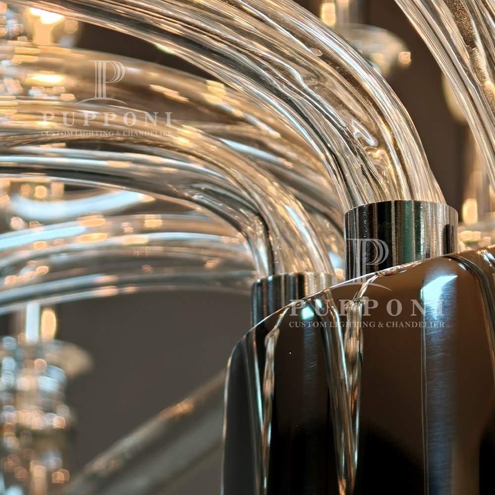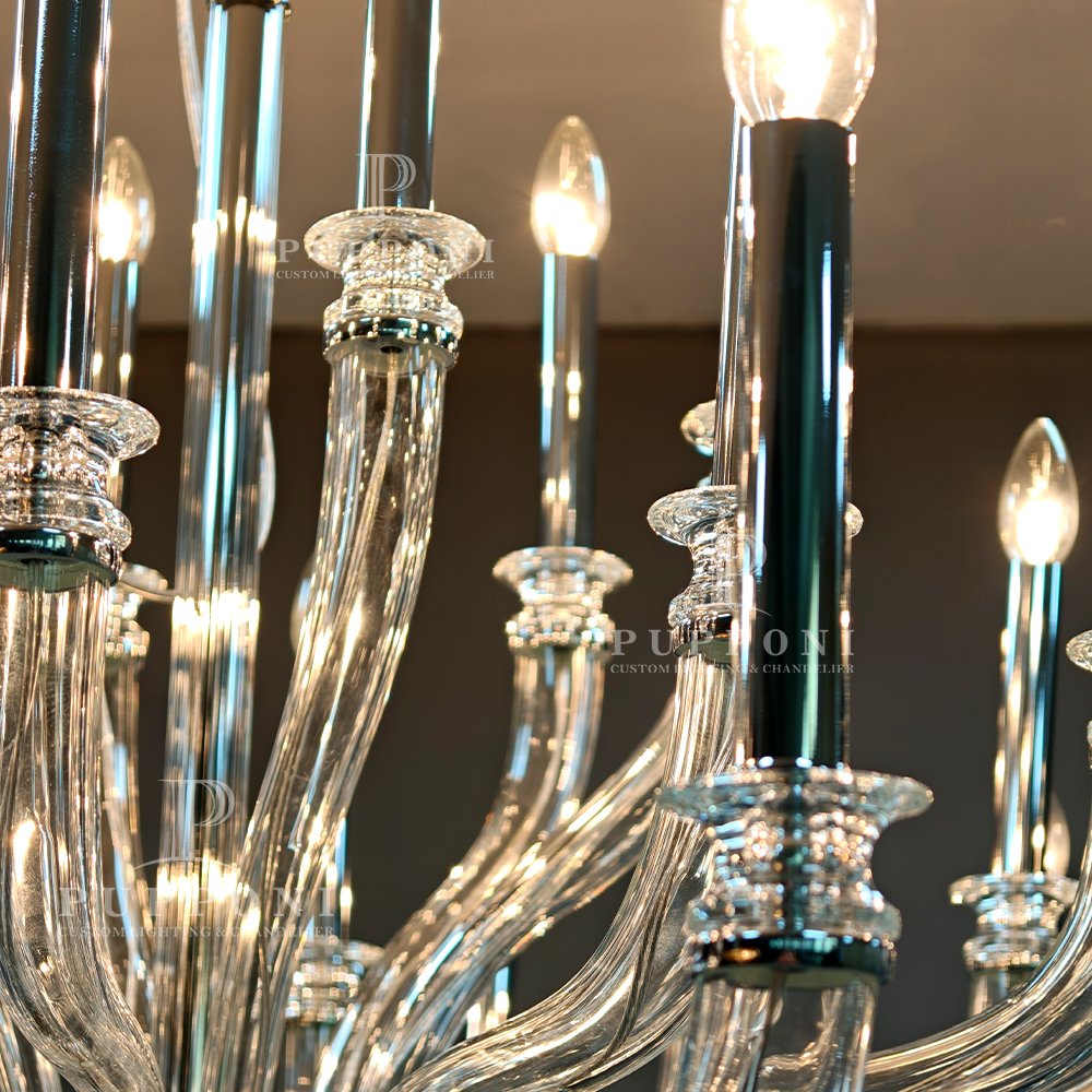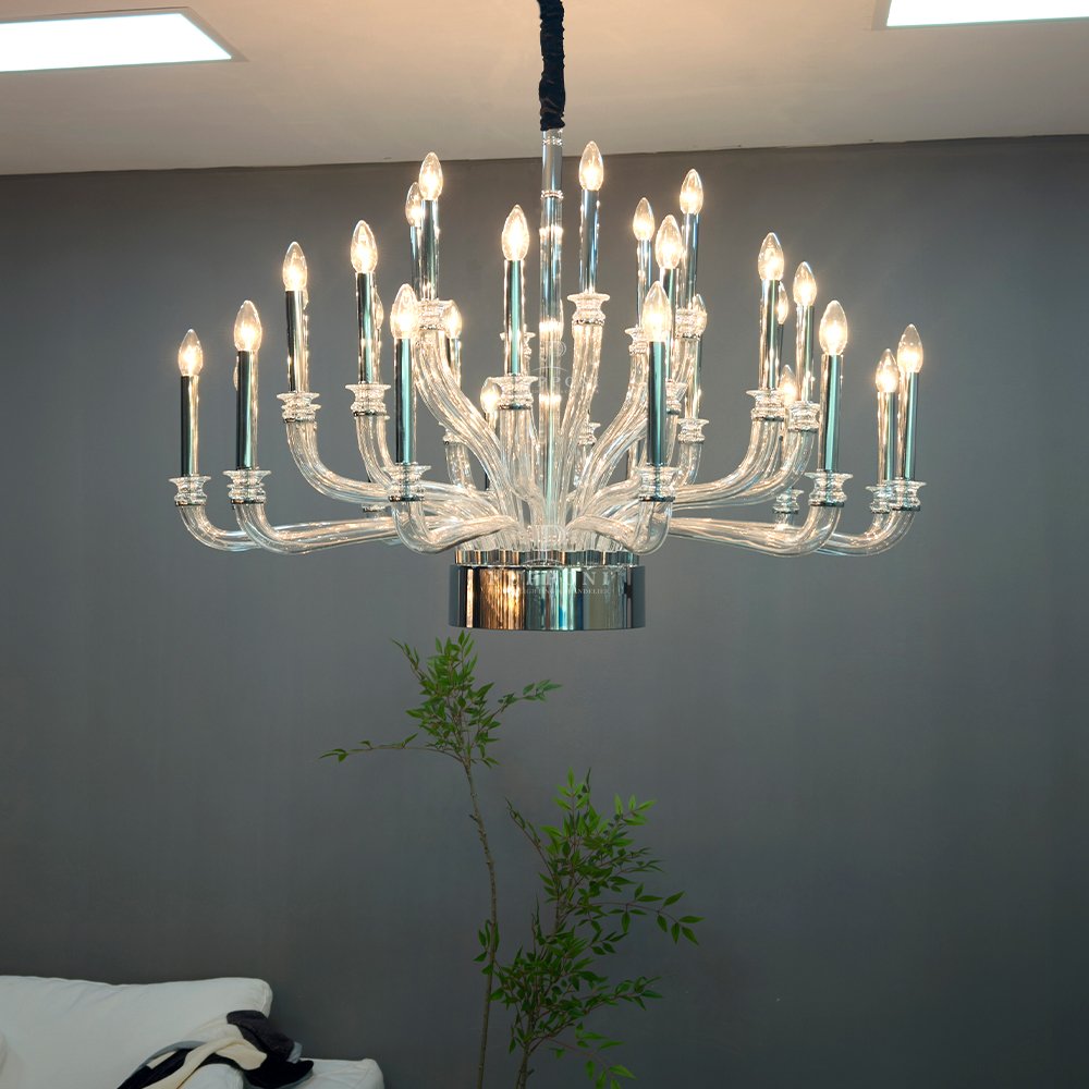 Elevate your space with this elegant glass chandelier. Crafted from clear curved glass with polished chrome accents, it features multiple candle-style lights for a warm, luxurious glow. Perfect for dining rooms, living areas, or entryways, it blends modern and classic design to elevate any interior.