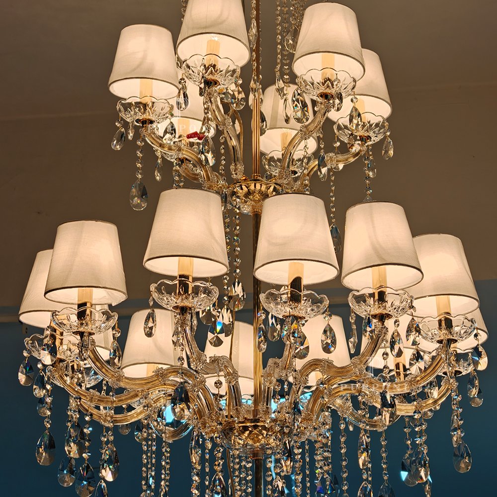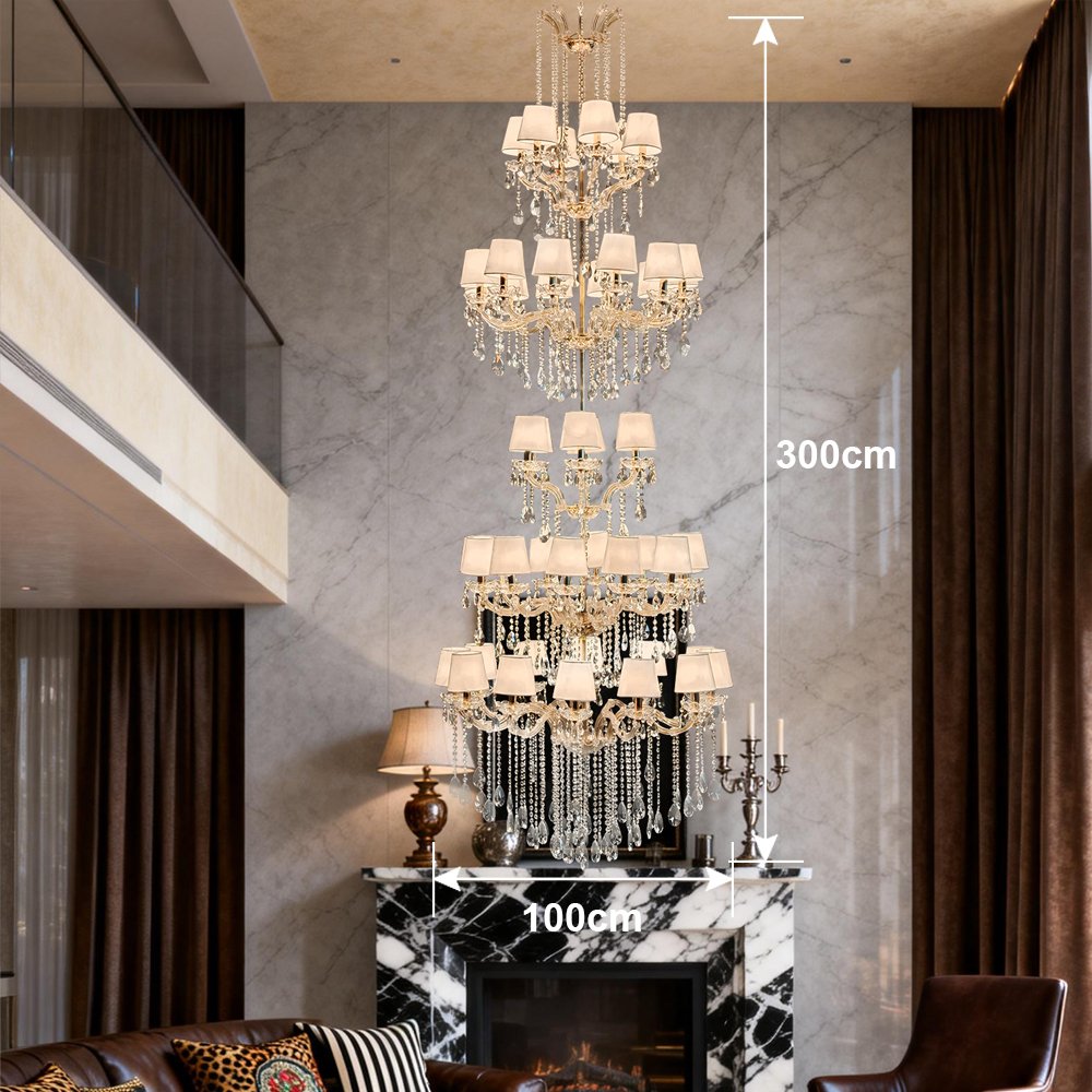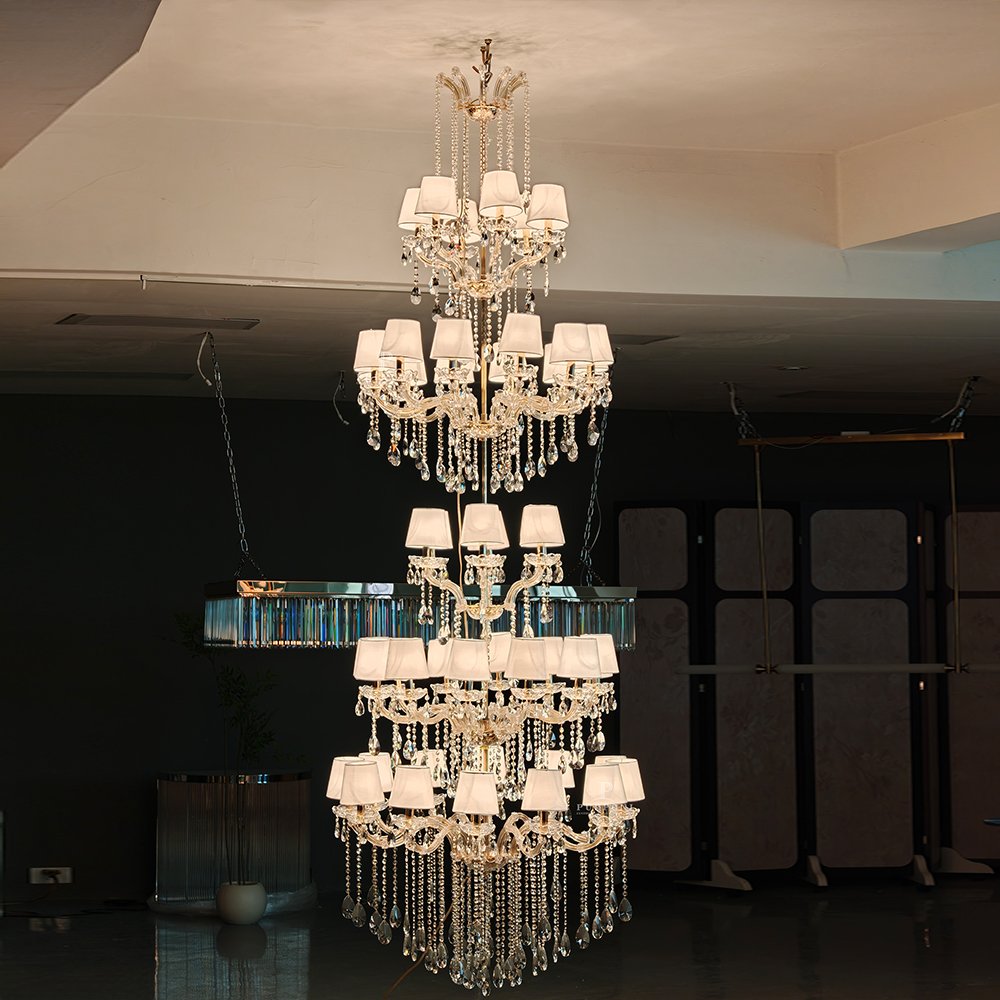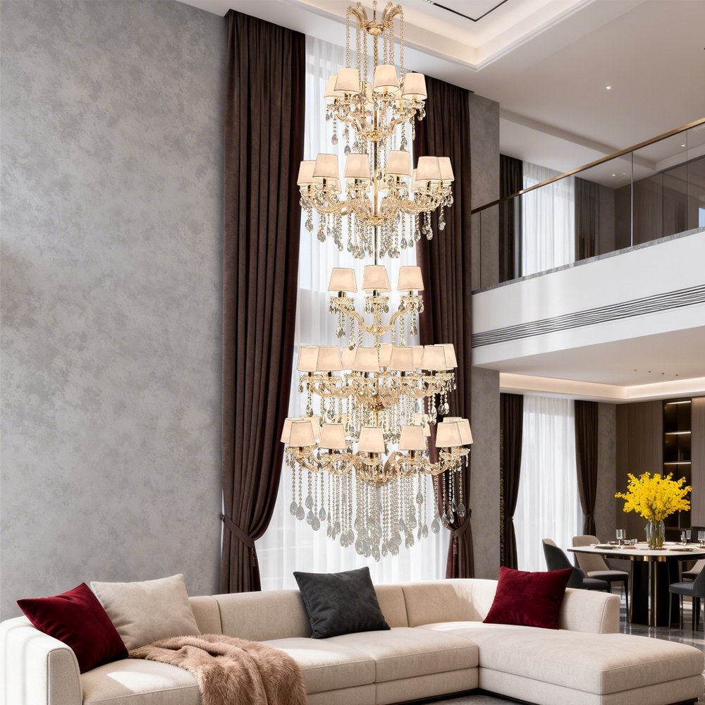 Elevate your grand space with this opulent tiered crystal chandelier. Crafted with a polished gold frame, cascading crystal prisms, and soft linen shades, it casts a warm, radiant glow that refracts beautifully across large rooms. Perfect for double-height living rooms, grand entryways, or luxury dining rooms, this timeless piece blends old-world glamour with modern luxury, adding unmatched opulence to any interior.