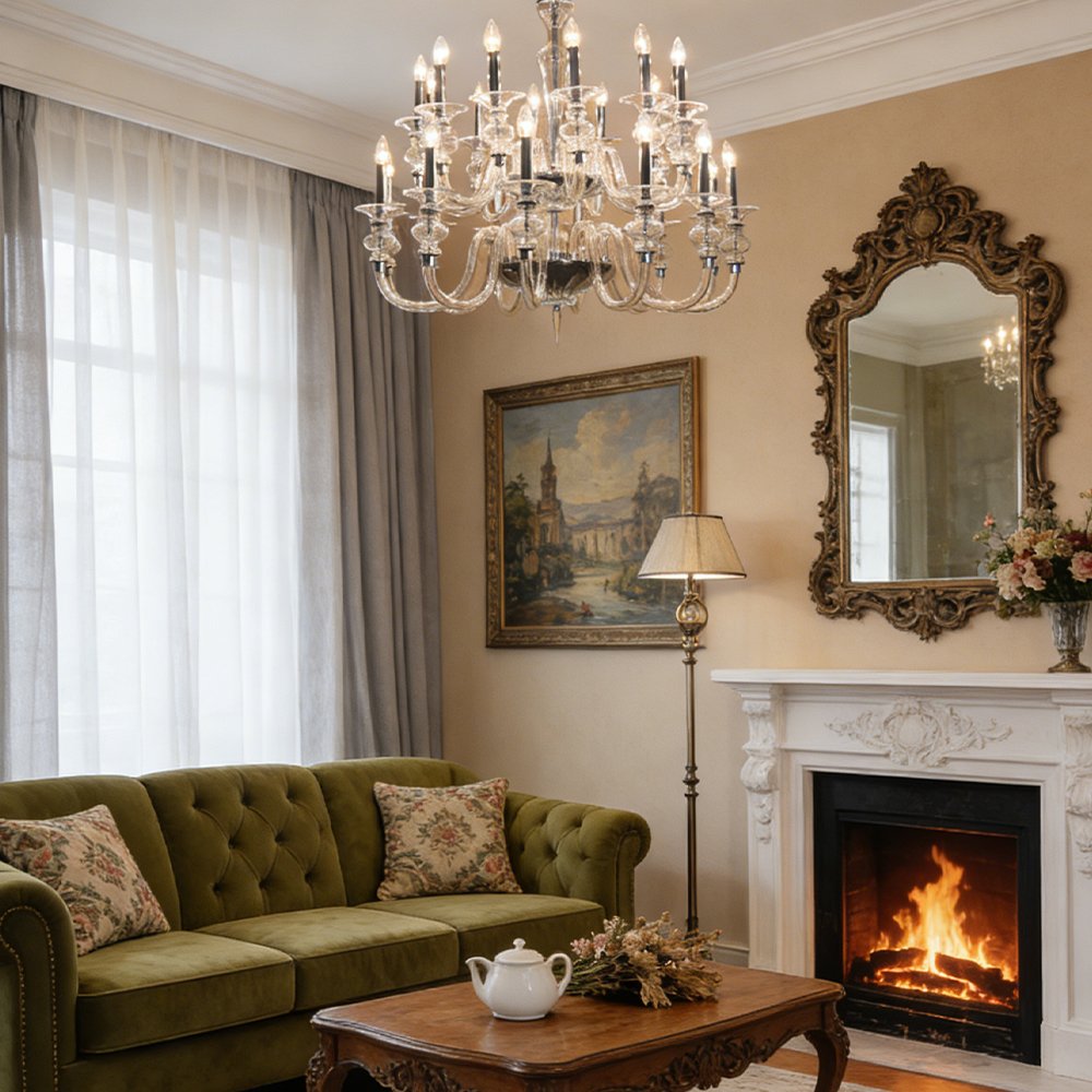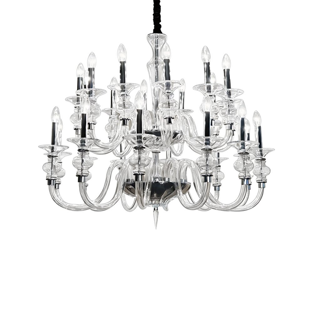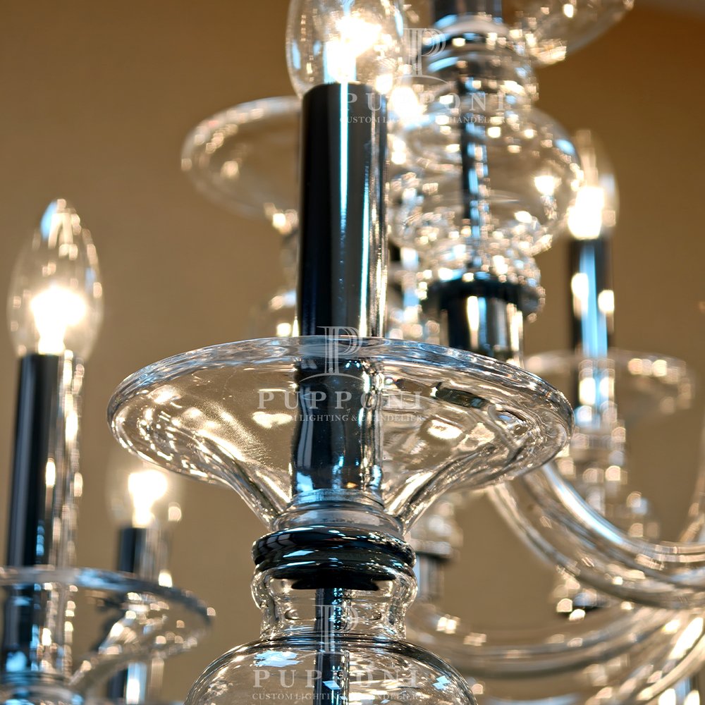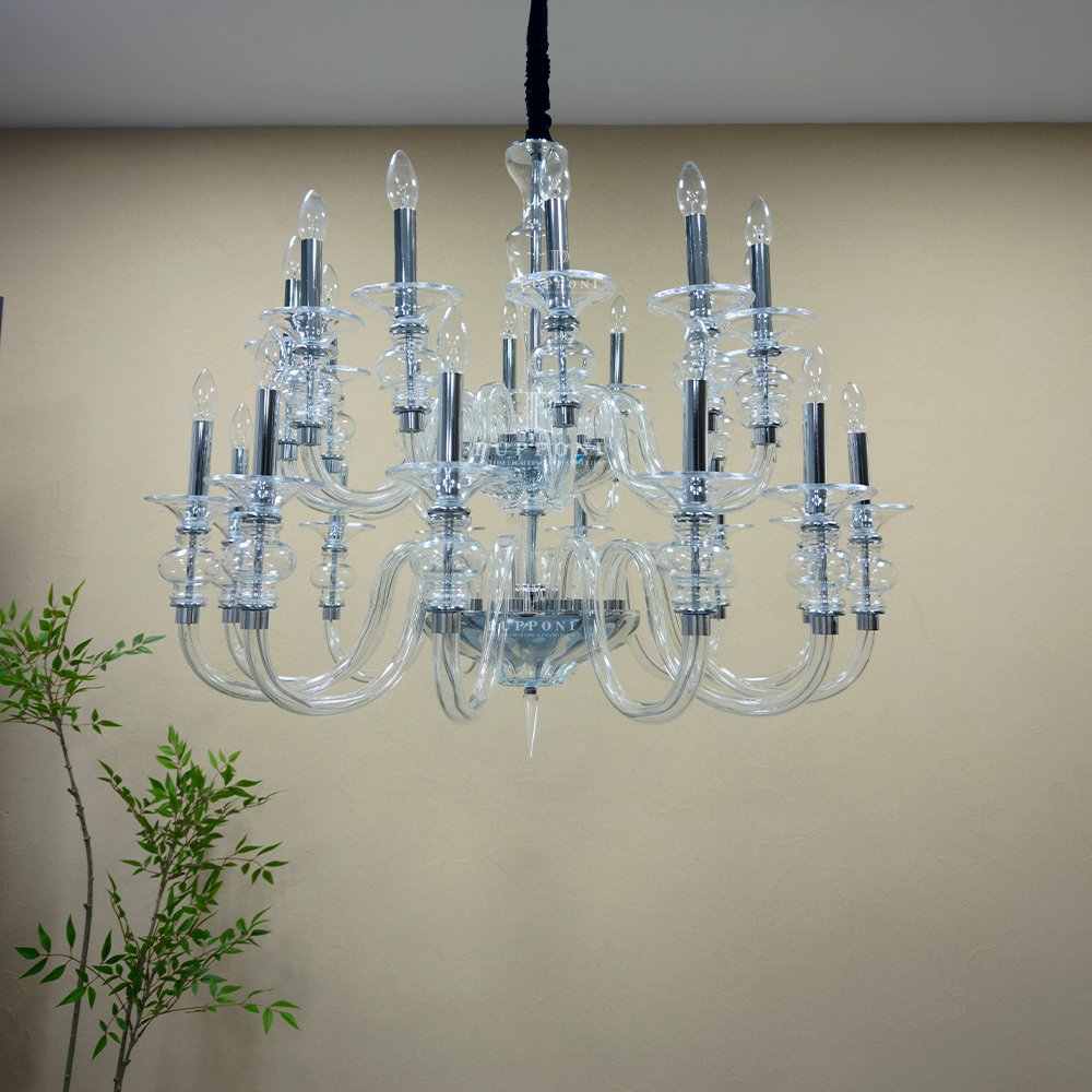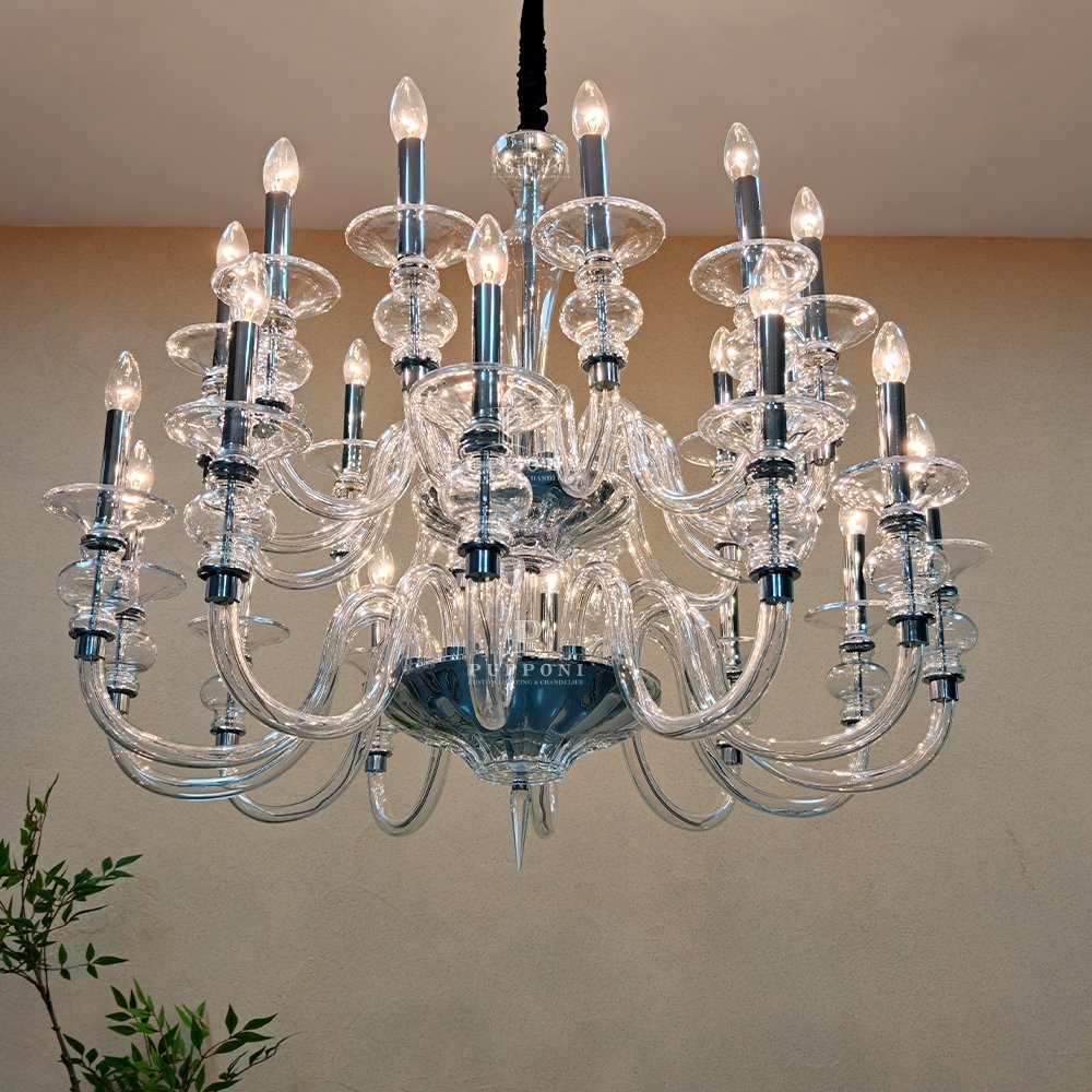 Elevate your space with this opulent tiered glass chandelier. Crafted from clear hand-blown glass with polished chrome accents, it features multiple candle-style lights for a warm, timeless glow. Perfect for grand living rooms, dining areas, or entryways, it blends classic elegance with modern luxury.