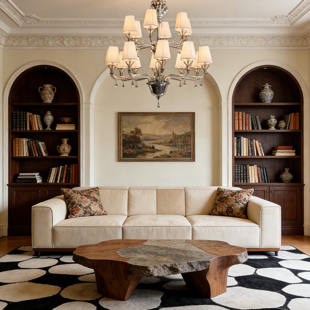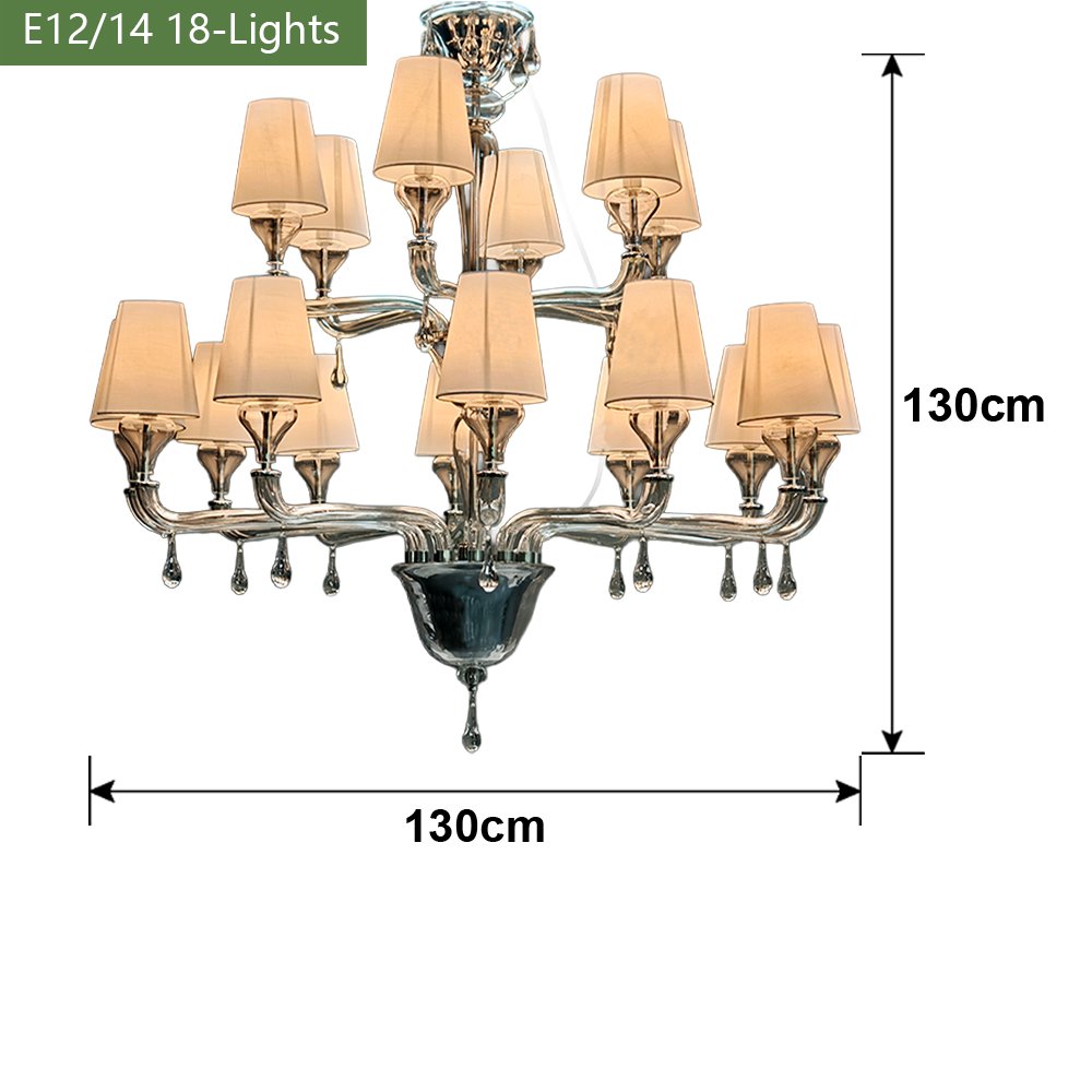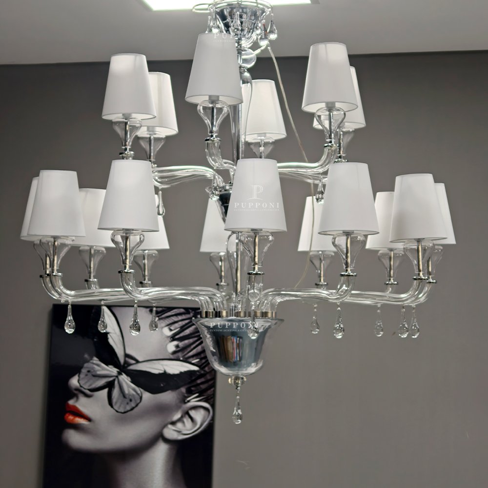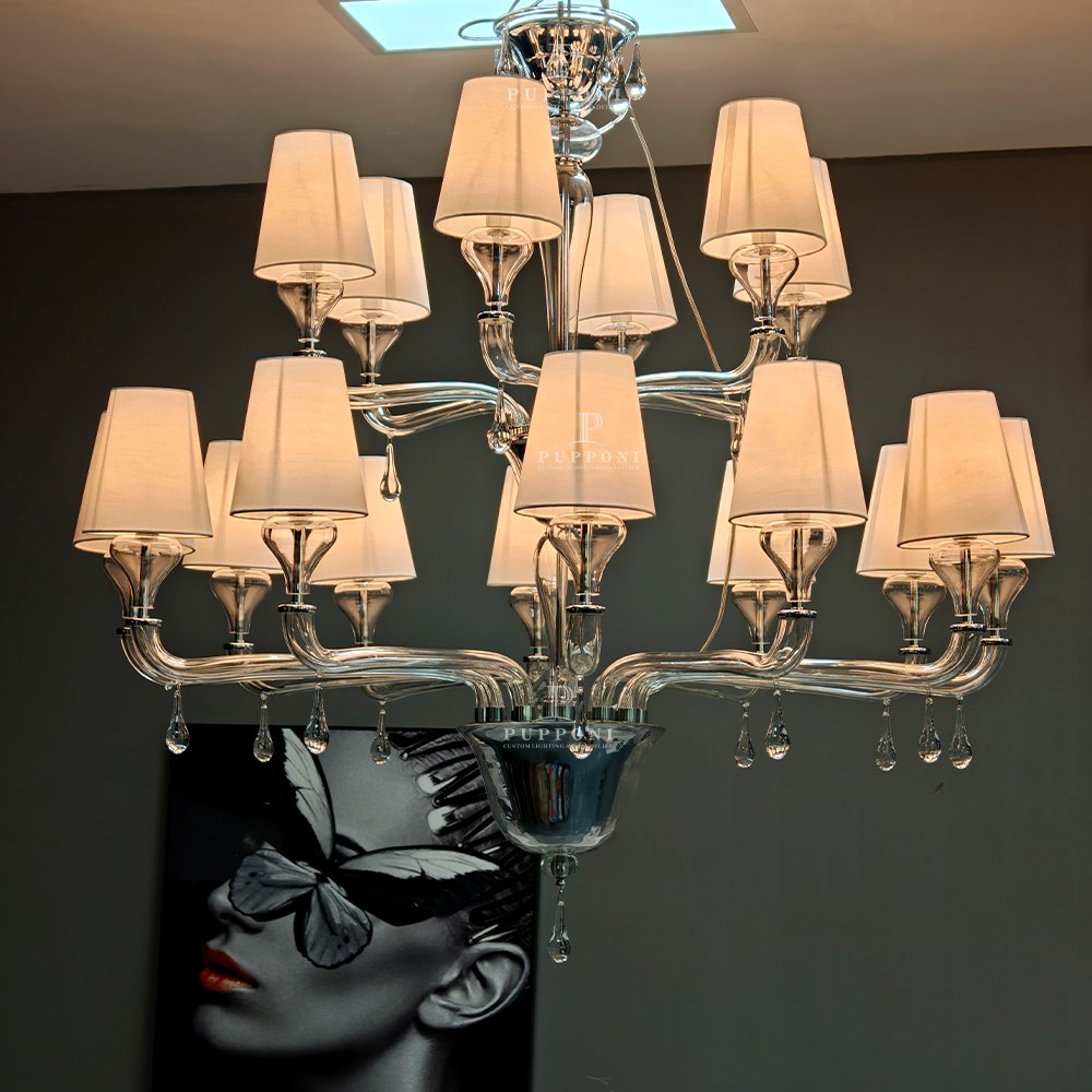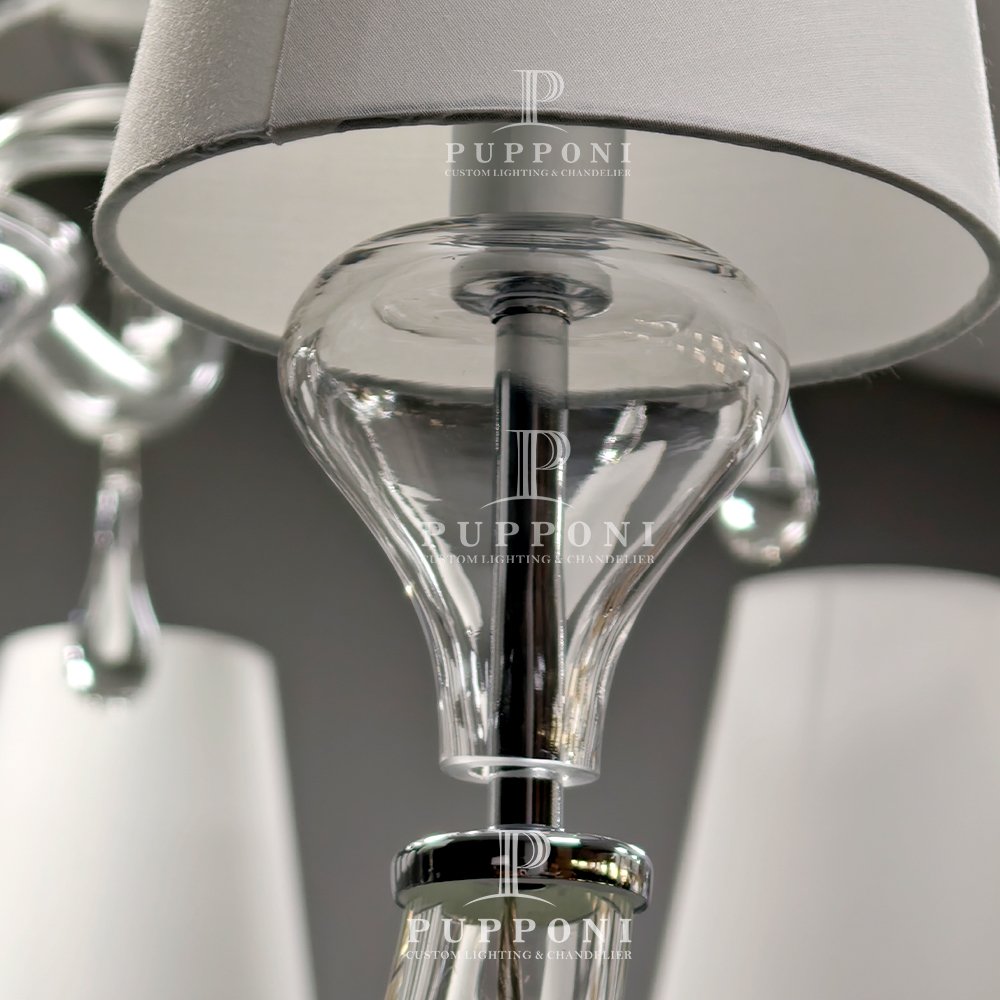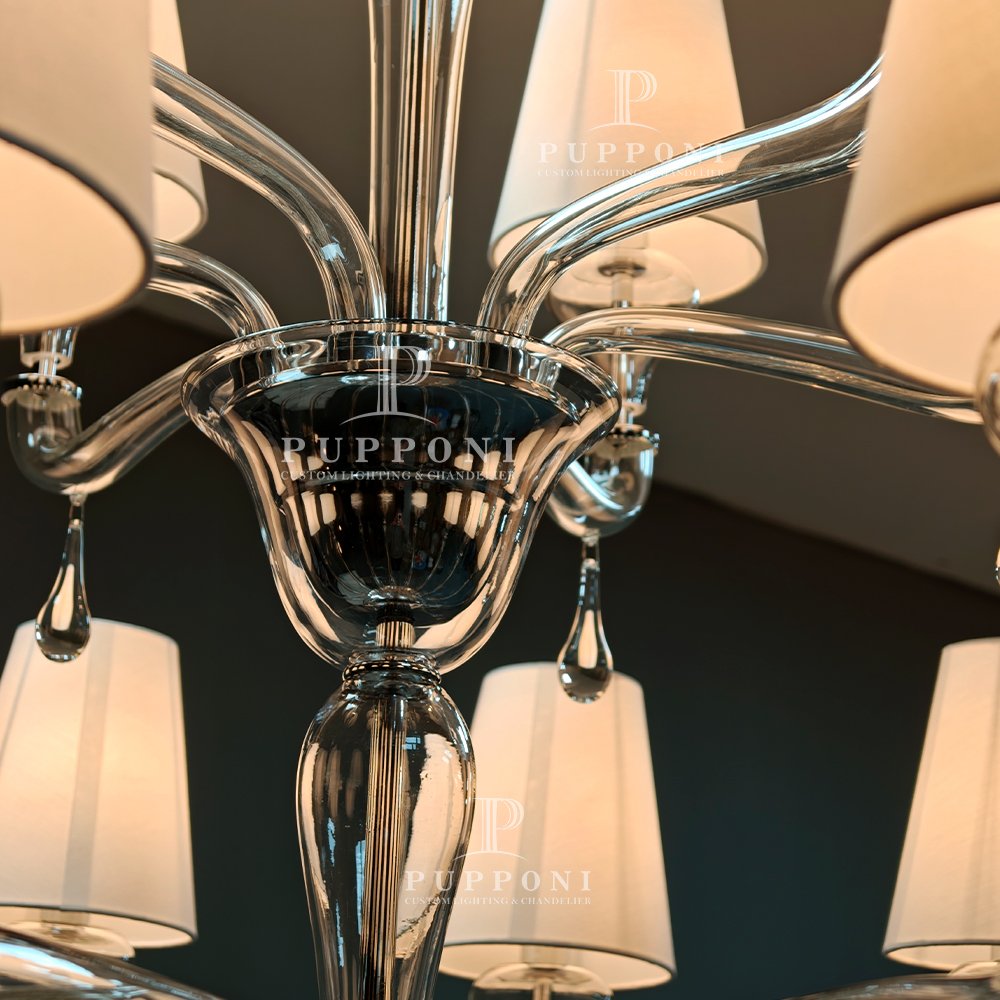 Elevate your space with this handcrafted Murano glass chandelier. Featuring swirling clear glass arms, soft linen shades, and sparkling crystal prisms, it casts a warm, elegant glow perfect for living rooms, dining rooms, or entryways. This timeless piece blends artisanal craftsmanship with modern luxury, adding refined sophistication to any interior.