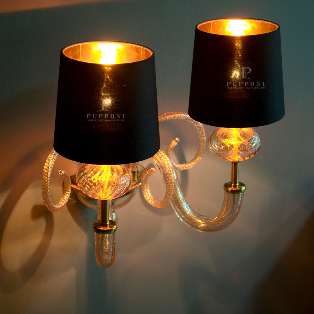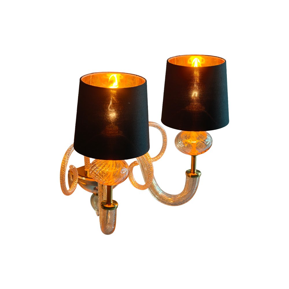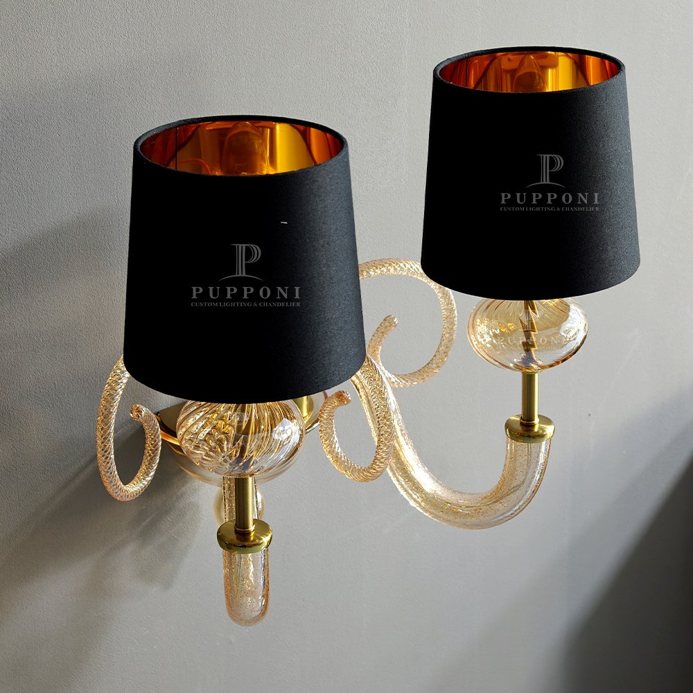 Elevate your space with this exquisite double-arm Murano glass wall sconce. Handcrafted with swirling gold-infused glass, polished brass accents, and black linen shades with gold lining, it casts a warm, luxurious glow. Perfect for living rooms, bedrooms, or entryways, this timeless piece blends artisanal craftsmanship with modern elegance, adding opulence to any interior.