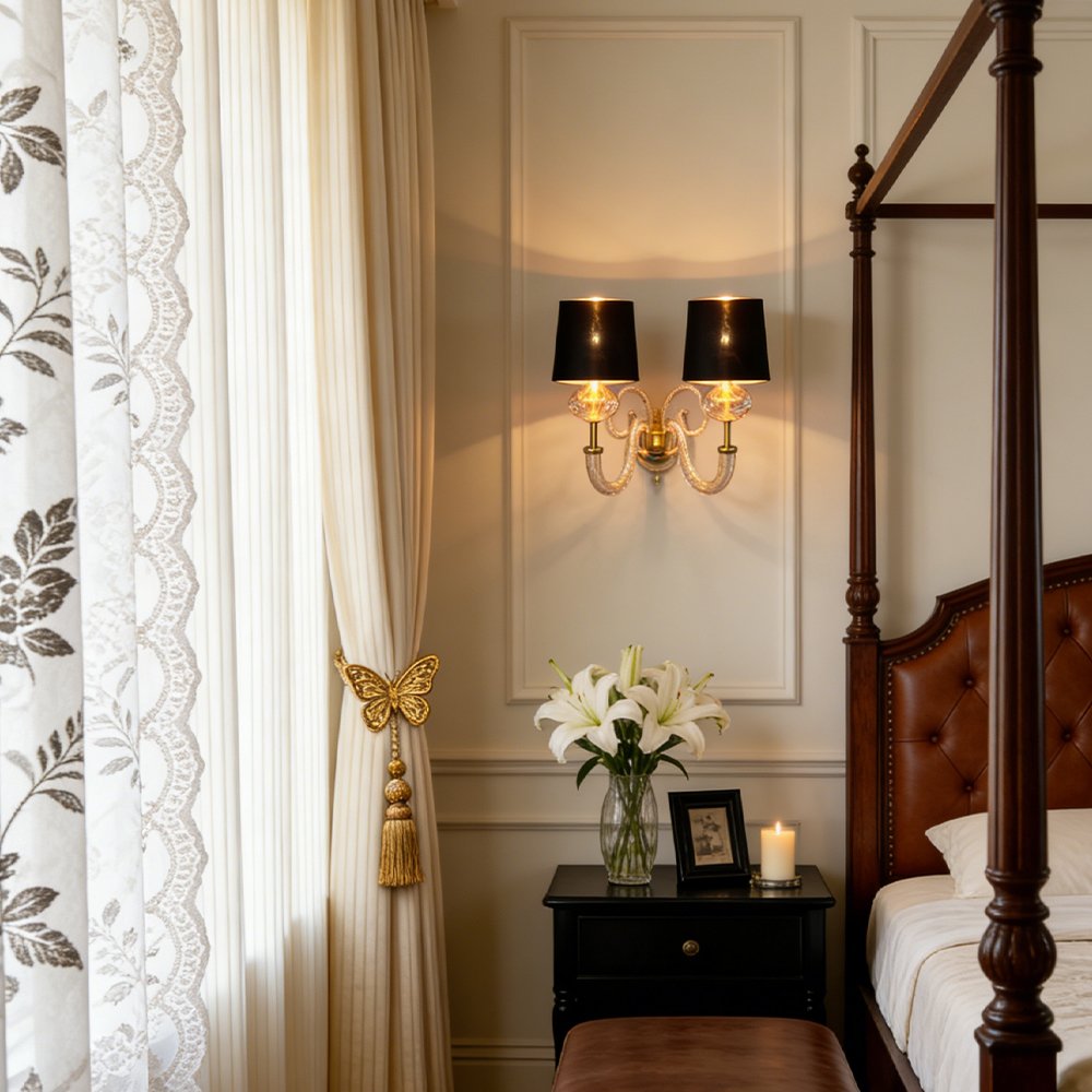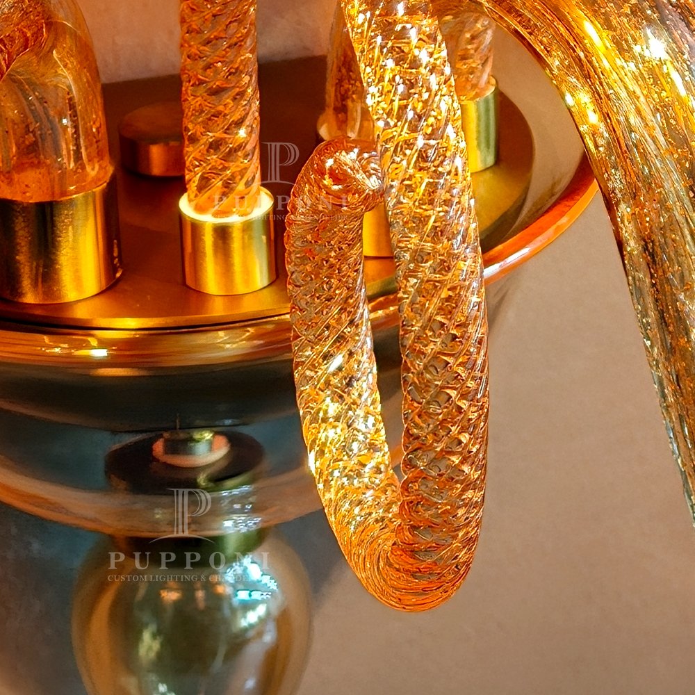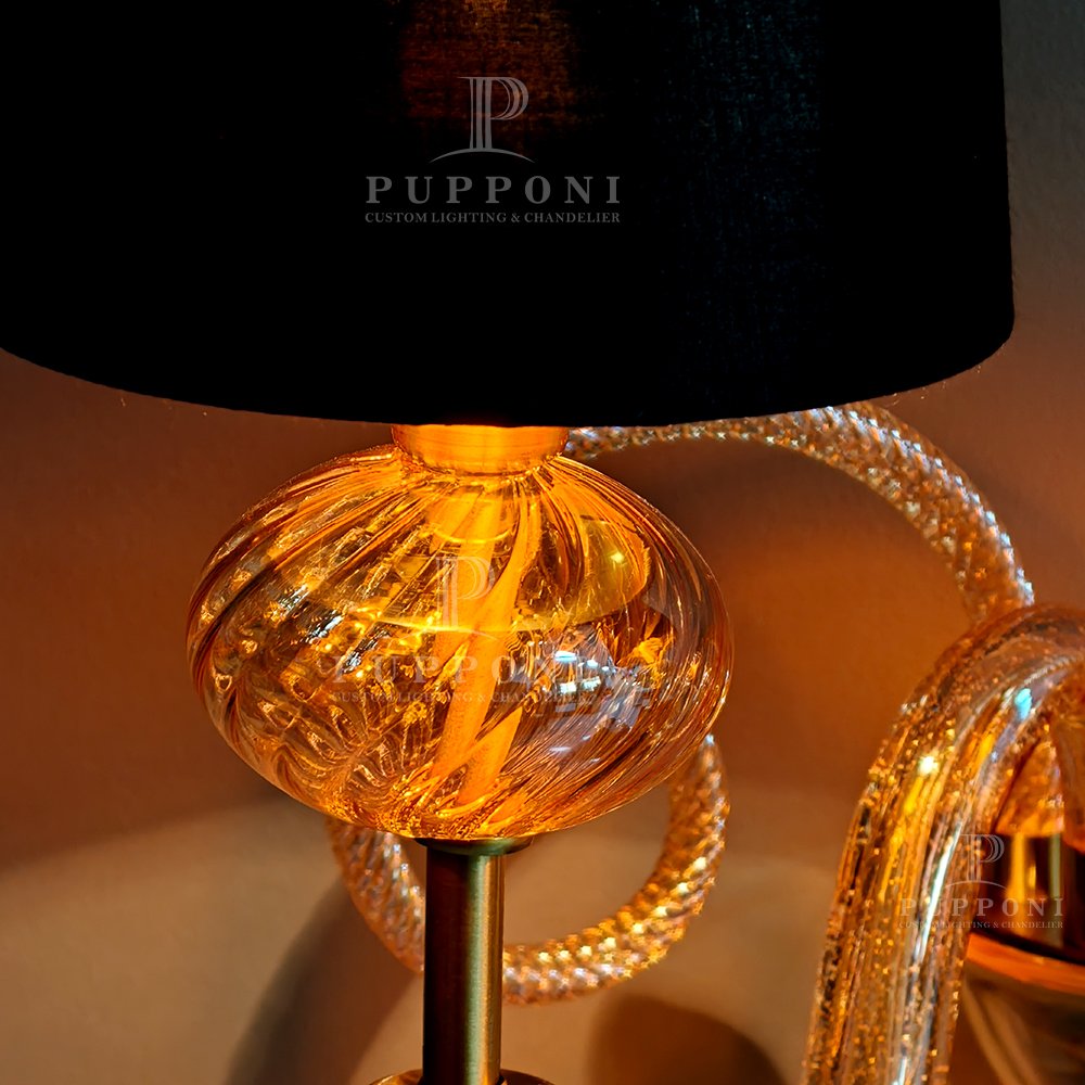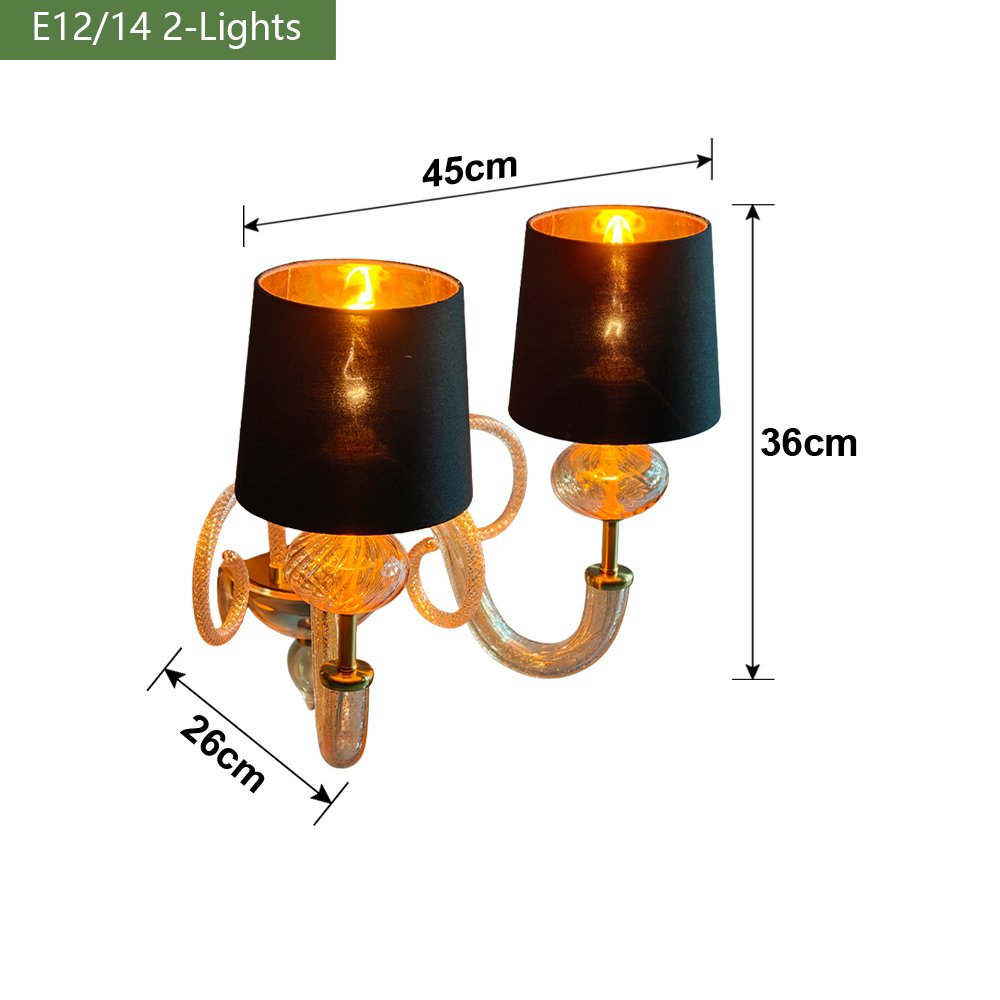 Elevate your space with this exquisite double-arm Murano glass wall sconce. Handcrafted with swirling gold-infused glass, polished brass accents, and black linen shades with gold lining, it casts a warm, luxurious glow. Perfect for living rooms, bedrooms, or entryways, this timeless piece blends artisanal craftsmanship with modern elegance, adding opulence to any interior.