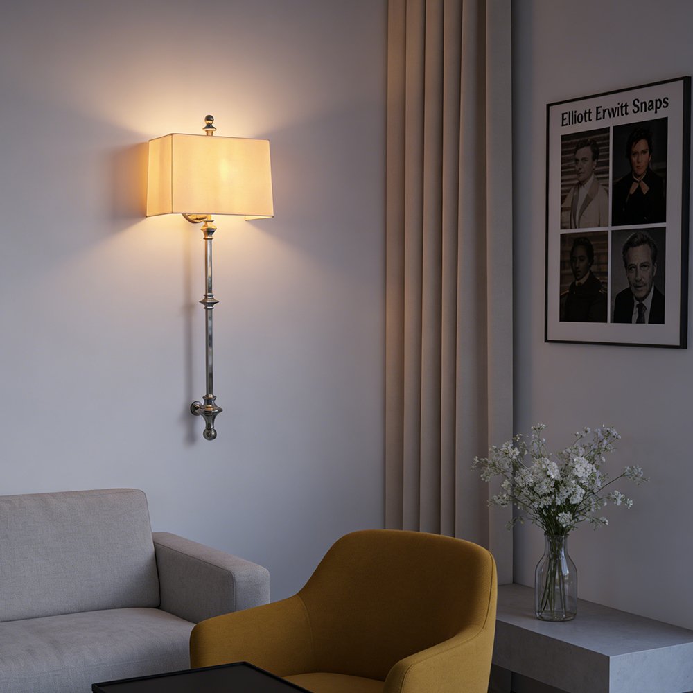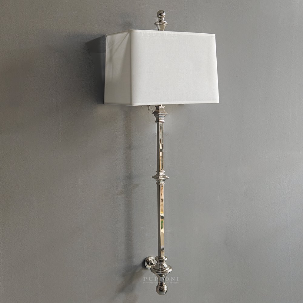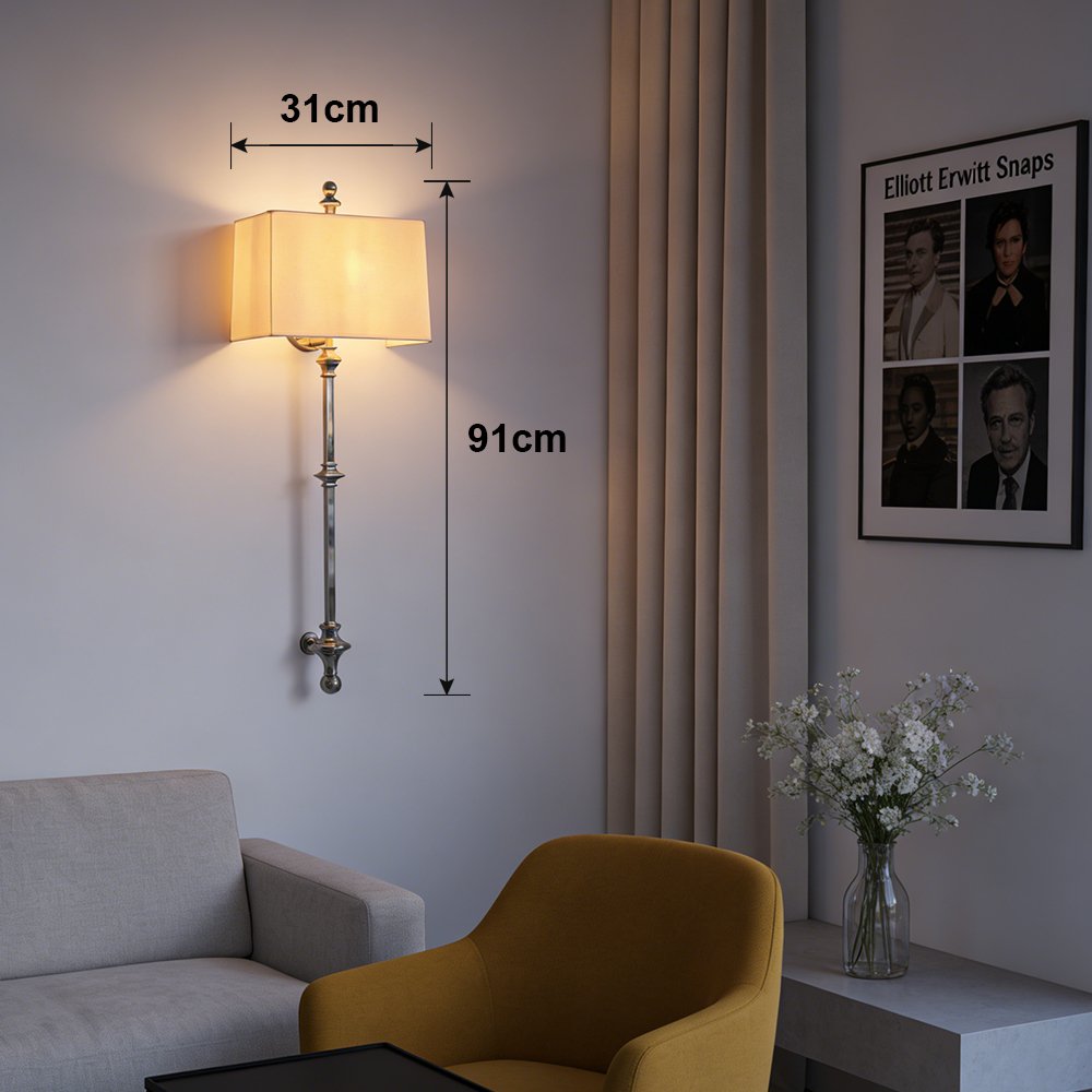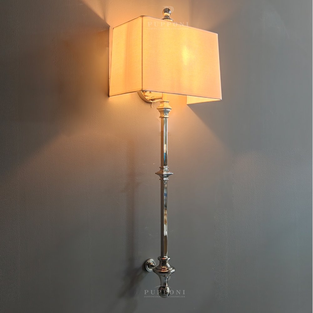 Elevate your space with this elegant long wall sconce. Crafted with a polished nickel finish and a soft linen shade, it casts warm, diffused light, blending timeless sophistication with modern luxury. Ideal for bedrooms, living rooms, or hallways, this refined fixture adds understated glamour and functional illumination to any interior style.