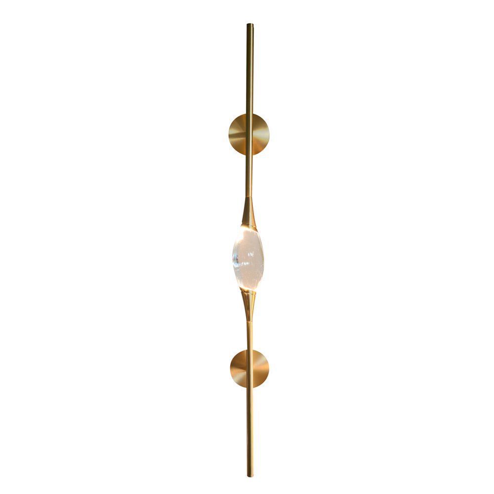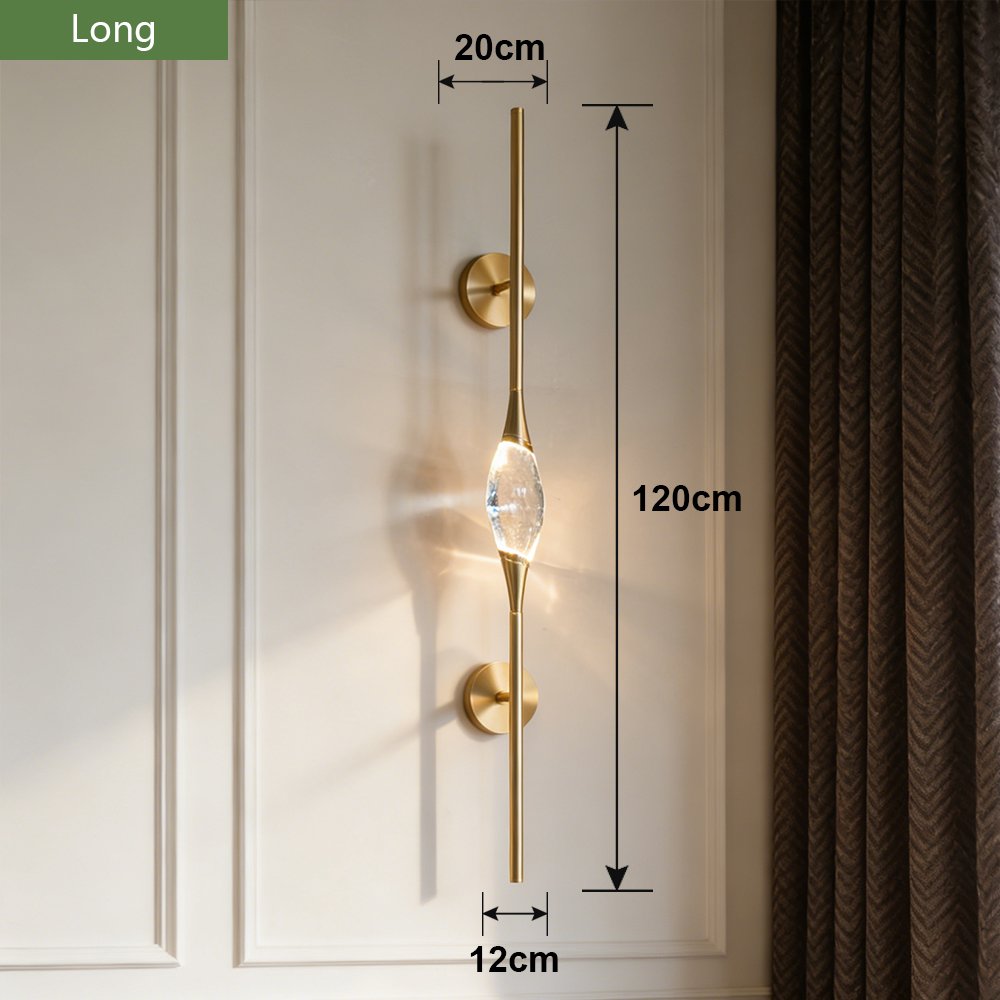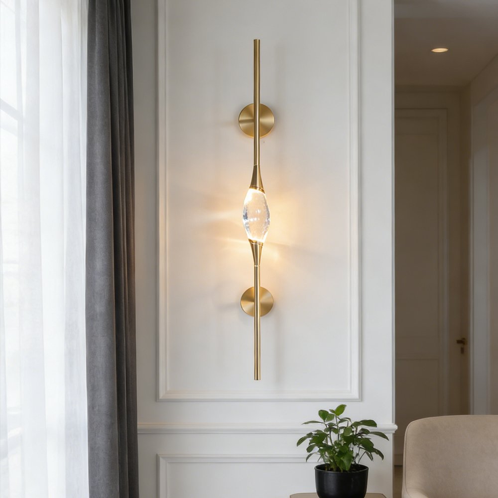 Elevate your space with this sleek tall wall sconce. Crafted with a polished brass frame and hand-blown bubble glass centerpiece, it casts a warm, ambient glow that refracts beautifully across walls. Perfect for entryways, living rooms, or bedrooms, this minimalist design blends modern luxury with timeless style, adding refined sophistication and functional illumination to any interior.